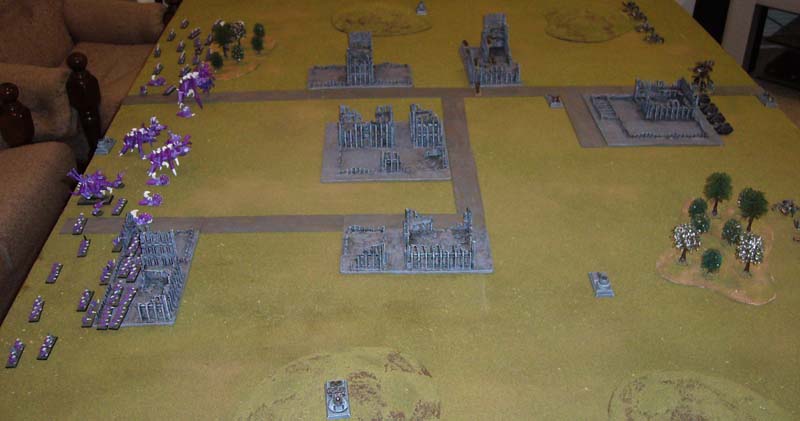 Turn 1: Tyranids rush across the board, Ravager Titan advances and kills a Hierophant, but other two tyranid biotitans close rapidly with it and Warlords formation. One Defiler formation starts flanking around the right (top of picture), the other fails its initiative check and regroups.