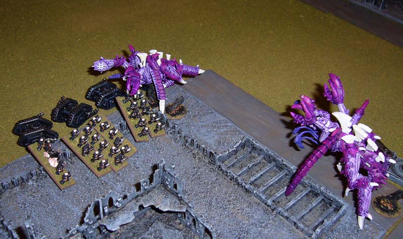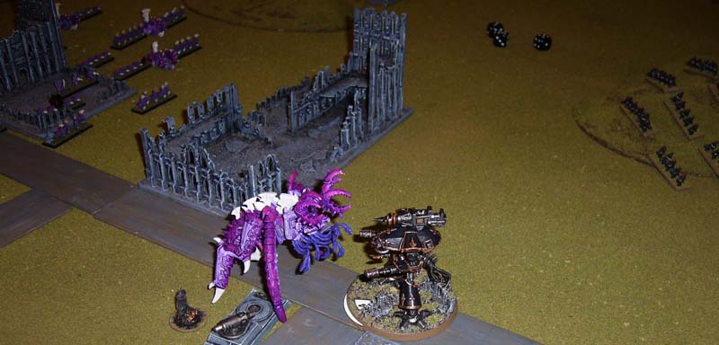Turn 2: Tyranids win strategy roll! Hydraphant rips open Ravager and follows into firefight range against Warlords formation.