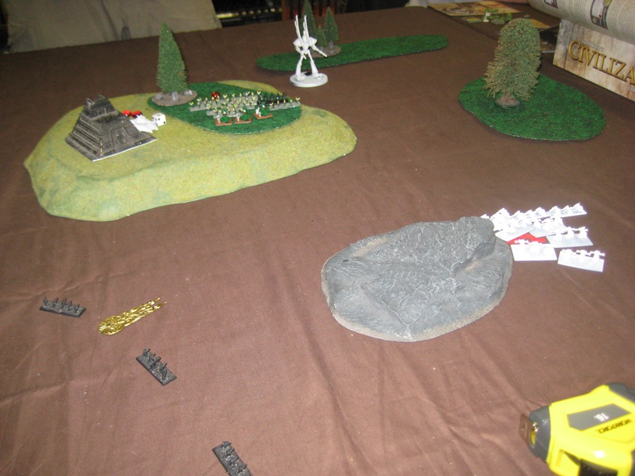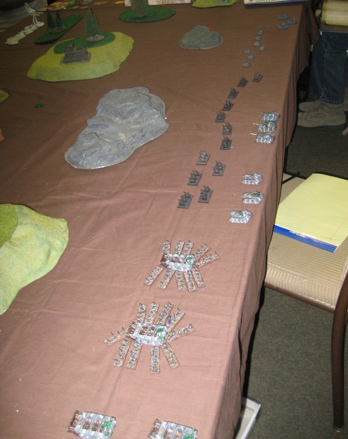 Seeing an opening against 11th company, the other Storm Serpent marches to the right side in preparation for a webway assault against them. Guardian 1 spills out to clip the formation and bloody combat ensues. The Eldar lose 2 Wraithguard, but kill 3 Grenadiers and 5 Centaurs which breaks the Grenadiers. They fall back towards the center of the board, while the Guardians take position on a forested hill.