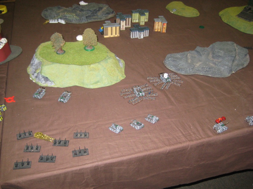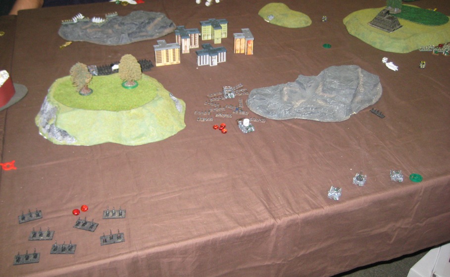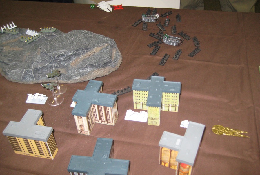 2nd Company moves closer to the Eldar side of the board, but maintains a healthy distance from the Wraithgate. The Swords advance to shoot at 2nd Companies Gorgons, and immobilize one of them. Red Squadron rocket attacks inflict damage against the remaining Storm Serpent, while skirting AA coverage from the Phantom. Guardian 2 doubles out of the Wraithgate to attack 1st Company, and manage to damage one of the Gorgons.