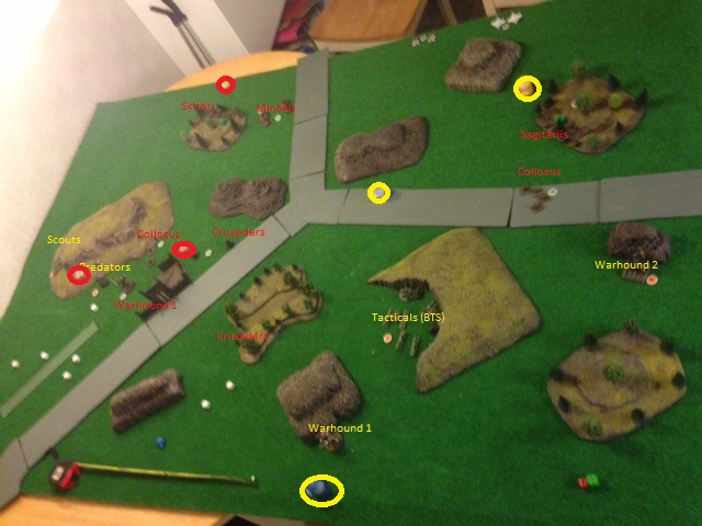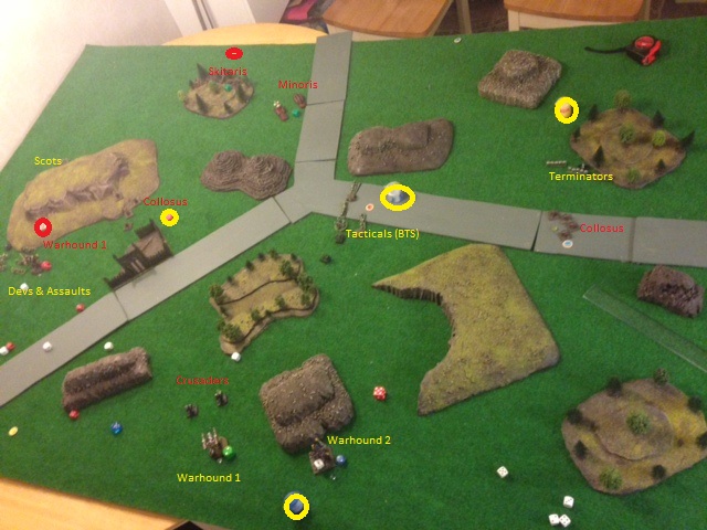 Scouts garrison nera the centerline on the board proecting the 2 AM T&H objectives. Sagitarii garrison in a forest close to 1 SM T&H objective on the right flank. Crusaders garrison near the centreline.