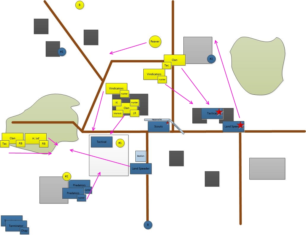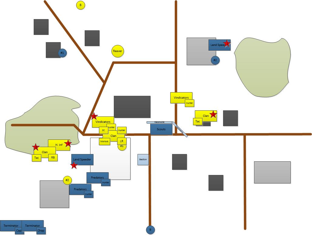 ). The Clan consolidates just out of ZOC of the Land Speeders and where possible, in cover.