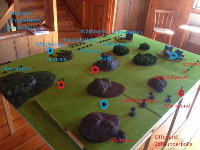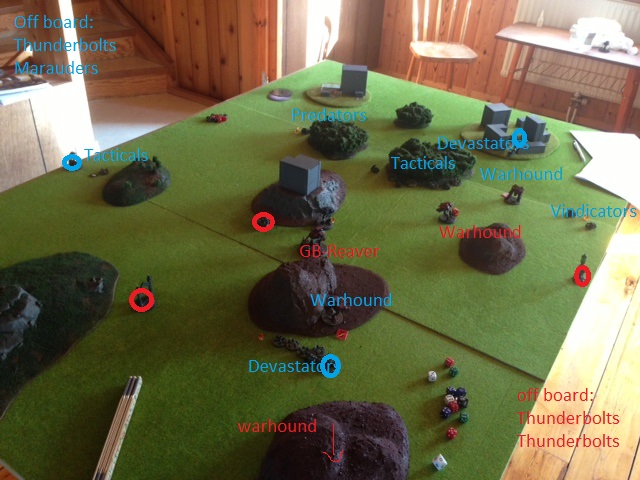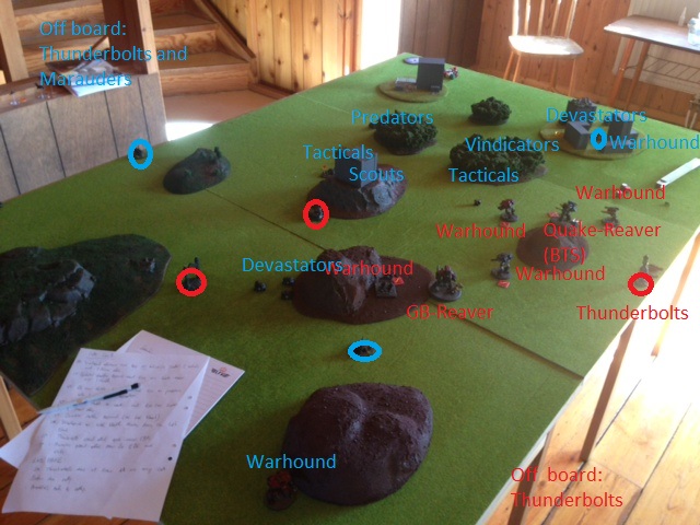 I set up all my titans on the left flank where both my T&H objectives and one of the SM ones where placed. The SM garrisoned their scouts in the middle. Other than that the SM spread out over the whole table.