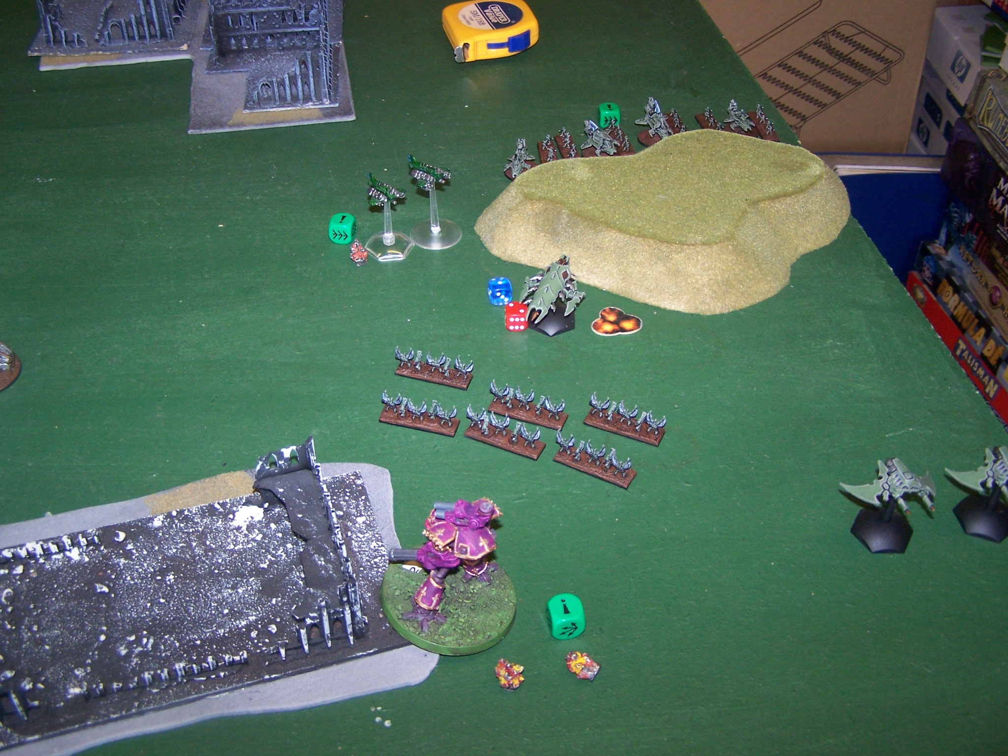 DE – Razorwings 1 ground attack sentinels 1 in the centre ruins killing 1 Sentinel and placing 2 BM
