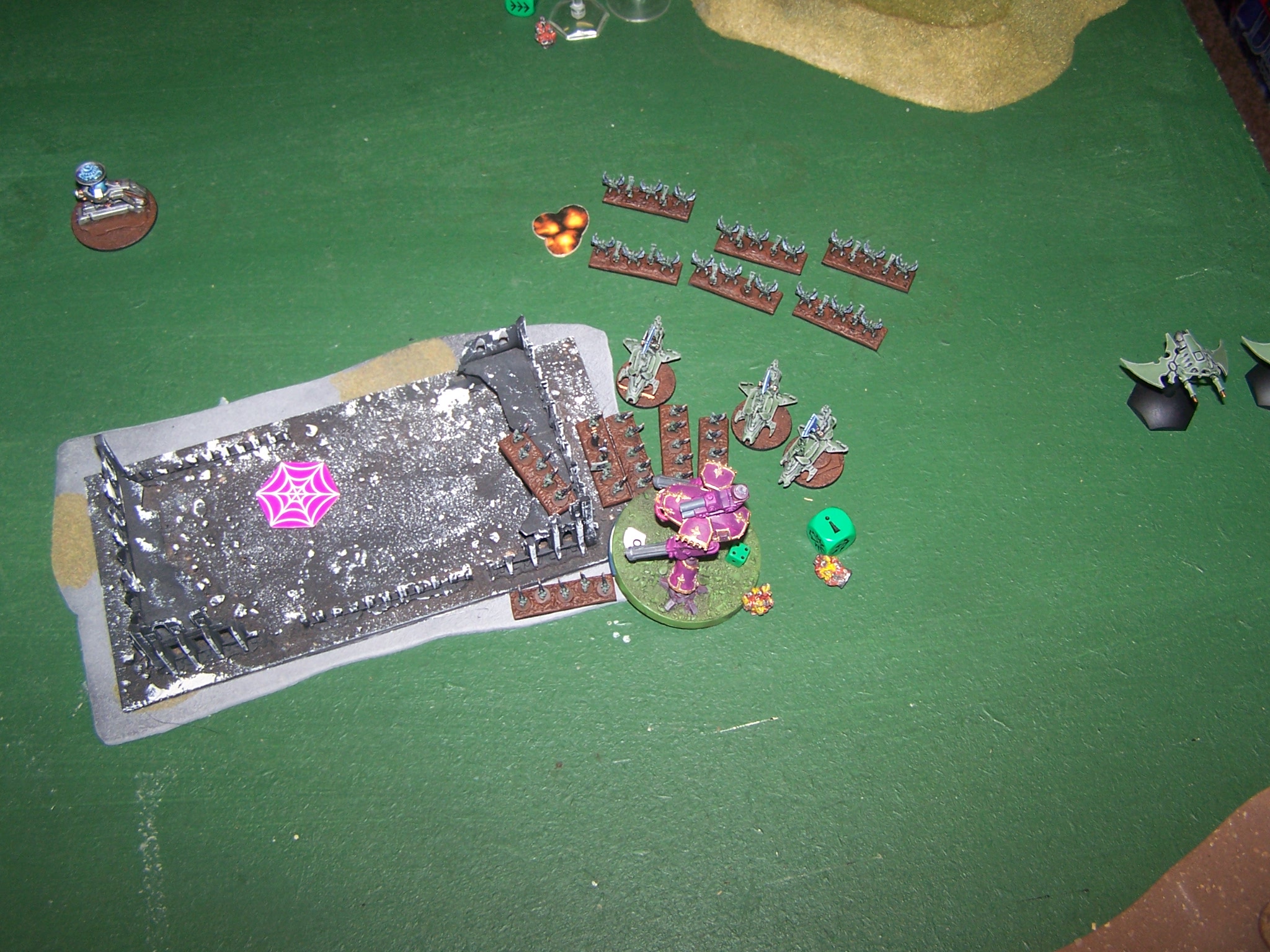 DE – Vessel of Pain 2 (on AMTL right flank) doubles forward to target Reaver 4. It pops up from behind a set of ruins and is hit by a barrage of plasma fire from Reaver 3. Both Shadowfields are lost and wound is caused. Firing the Vessel of Pain hits once taking down a shield and placing a BM.