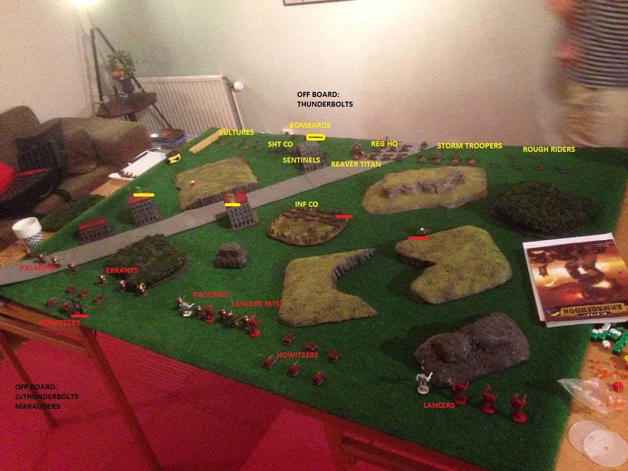 SL: garrisoned inf co marches into a building next to the forest they started in. K: Marauders ground attack vultures, kills 1 and breaks the formation. SL: Manticores sustain on Lancers and Paladins in middle of knight deployment zone, 1BM on each group. K: howitzrs return the favour and sustains on both SHT co and Sentinels, doing 1BM on both. SL: Thunderbolts ground attack howitzers, kills 2 gun transporters and 2 howitzers and breaks the formation. K: tunderbolts intercept tunderbolts and shoot them down. SL: sentinels doubles up on a hill on the left flank. K: thunderboltsground attacks sentinels, kills 2 and breaks the formation. SL: SHT Co doubles up on hill on left flank and fires on BTS-lancers, 1DC is done (2BM). K: BTS-lancers marshalls, shedding only 2 out of 3BM, and moves forward. SL: stormtroopers doubles forward and fires on the BTS-lancers, killing the baron and 1 lancer breaking the formation. K: lancers advances forward and fires on stormtroopers, killing 1 stand (2BM). SL: reg hq doubles forward. K: errants doubles forward towards middle and fires on stormtroopers, 1BM. SL: reaver titan doubles forward and fires on errants, only 1DC is made (2BM). K: paladins advances forward and fires on stormtroopers, killing 1 stand (2BM). SL: roug riders advance forward a little on the right flank. K: Paladins on left flank doubles forward and fires on SHT Co, 1BM