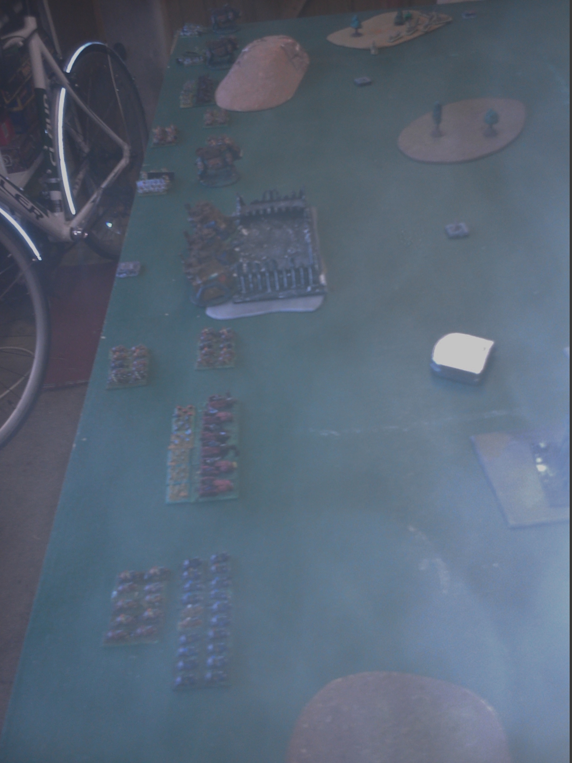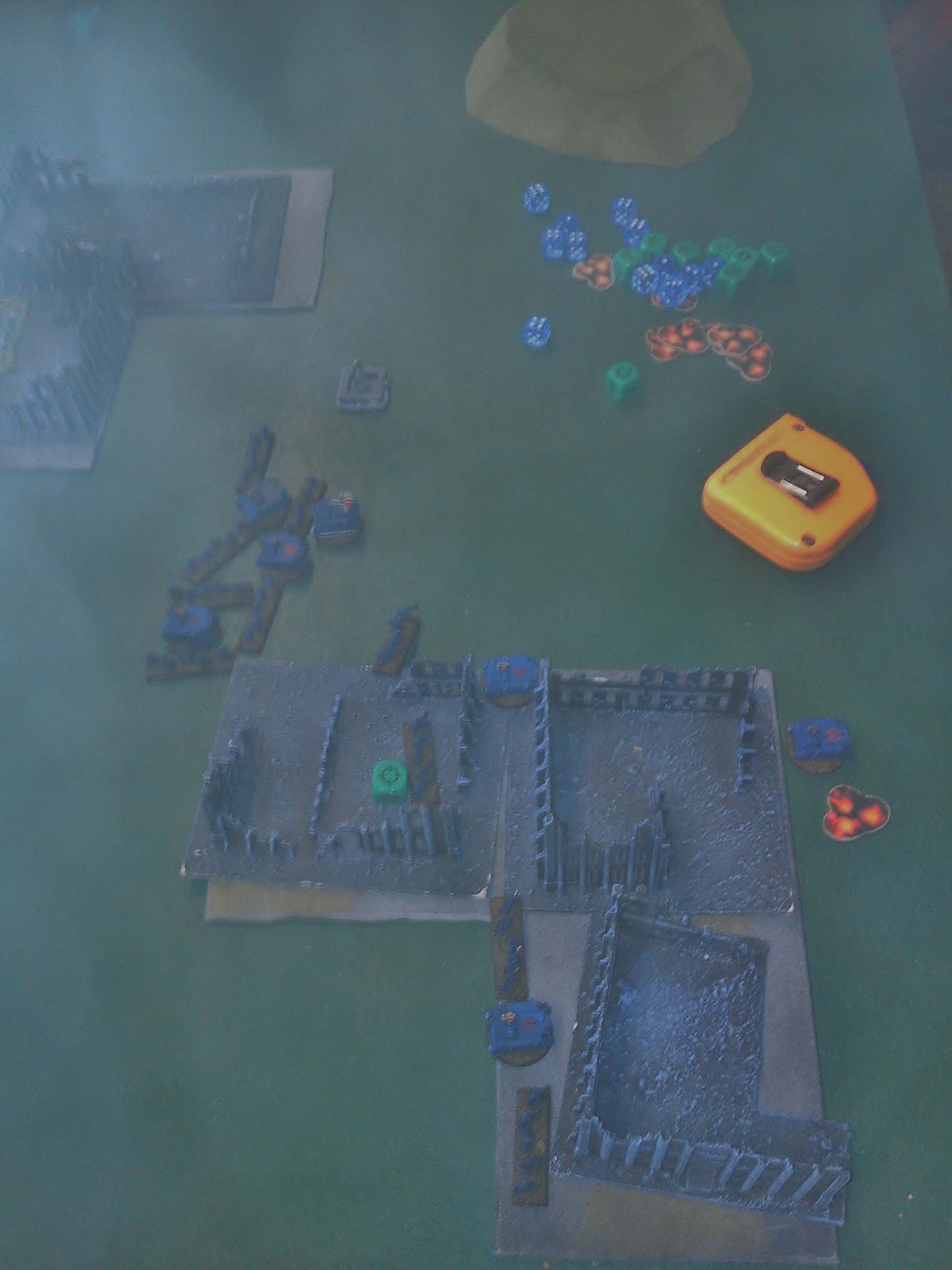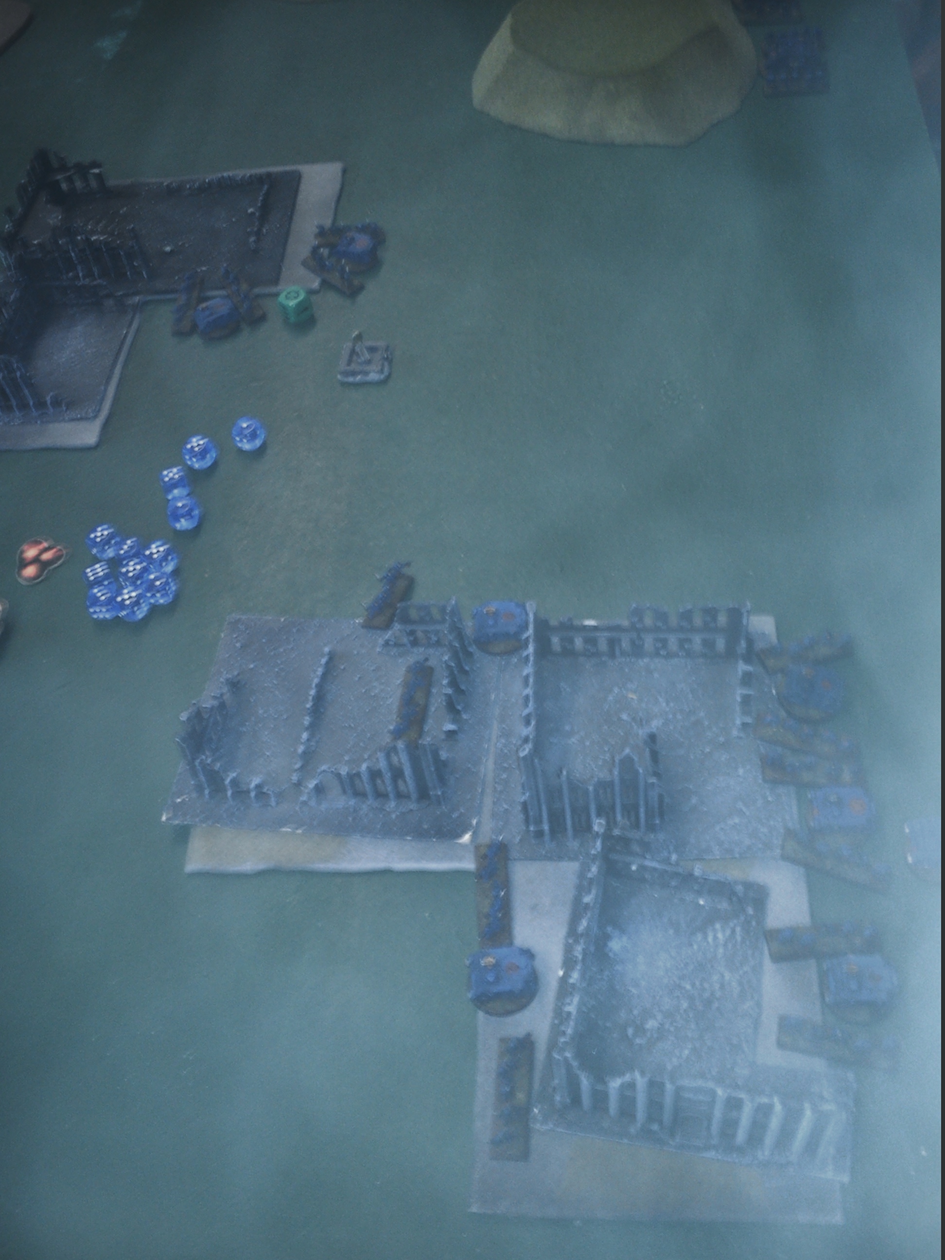 Turn 3 IF wins initiative IF-Centurion, Double (1 DC 2 BM Orkesurrus) IF-Tactical, Engage (3 Tactical & 2 Rhino die, 2 Warband die 2 BM, broken Tactical retreat into Bastion) FO-Boarboys, Engage (no hits but die from support) FO-Warband, Engage (1 Centurion & 1 Crusader die, 2 Warband die 2 BM, broken Centurion retreat behind woods lose 1 from combat) IF-Fellblade, Advance (1 DC 2 BM on Orkesurrus) IF-Fellblade, Fail (remove 2 BM) FO-Warband, Double (kill 2 tactical, broken Tactical retreat behind ruins) IF-Bastion Sustain Fire (2 DC, broken Warband retreat) IF-Scout, March FO-Warband, Double (1 BM on Scout) FO-Boarboys, Engage (kill 2 scout, 1 Boarboy support kill 2 Scout & 1 Rhino, destroying formation) IF-Thunderbolt, Ground Attack (Kill Boarboy 2 BM, 1 kill from AA) FO-Madboys, Double IF-Thunderbolt, Ground Attack (Kill Madboy 2 BM) FO-Big Boarboys, Double FO-Steam Gargant, Double (1 BM Scout)