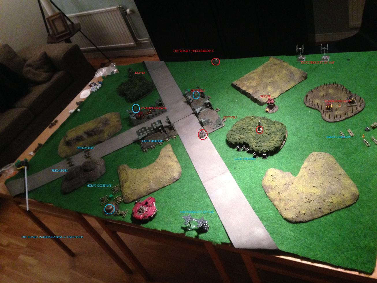 T: reaver on left flank goes on OW and awaits the drop podding terminators on the next turn.