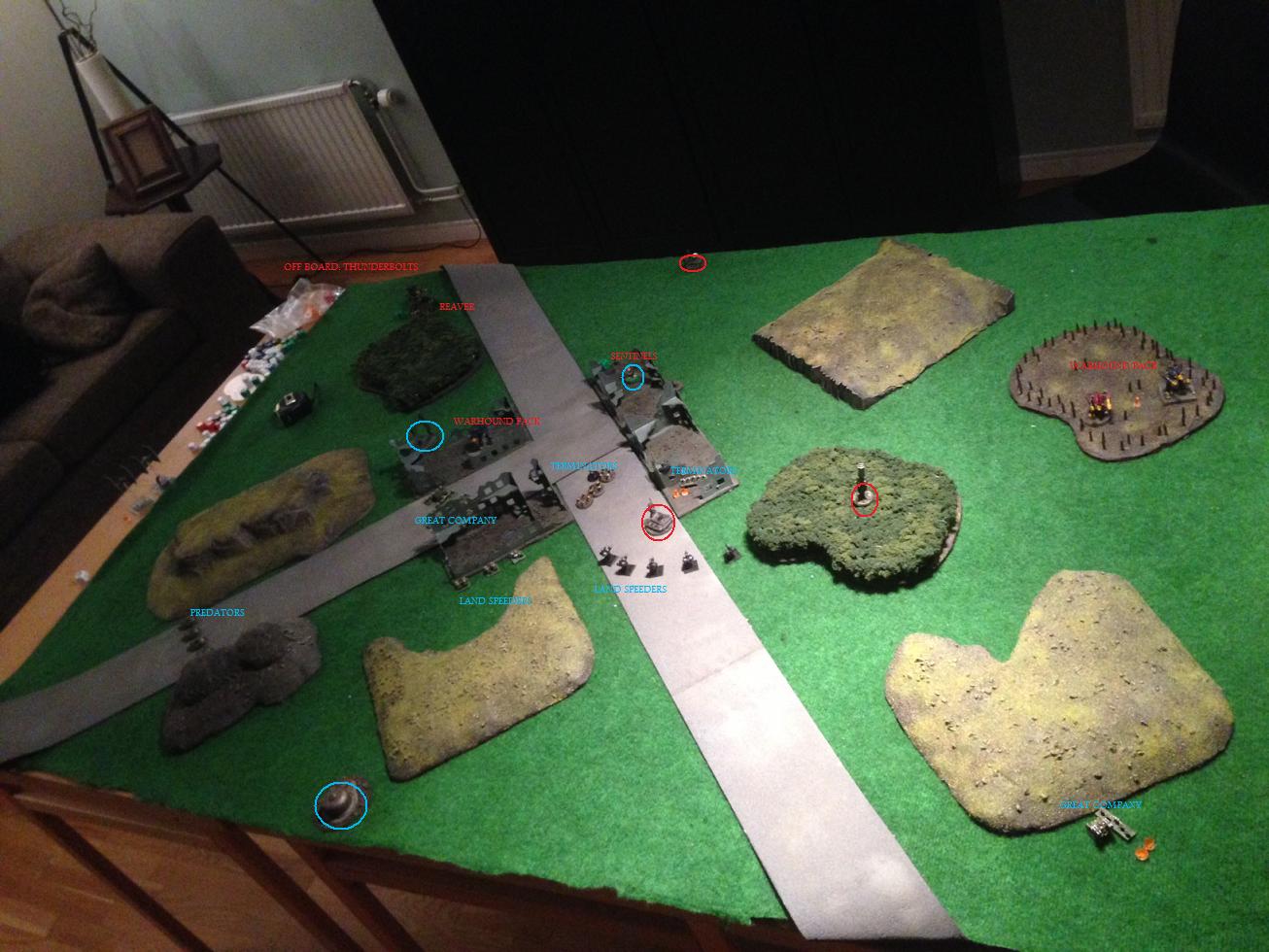 T: warhound pack on left flank doubles down the road to middle ruins.