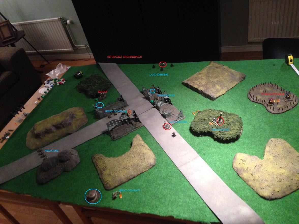 SW: great company by SW blitz doubles up to middle ruins and fires on broken warhound pack.