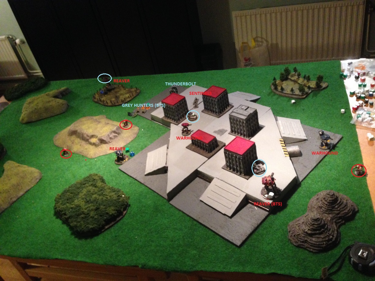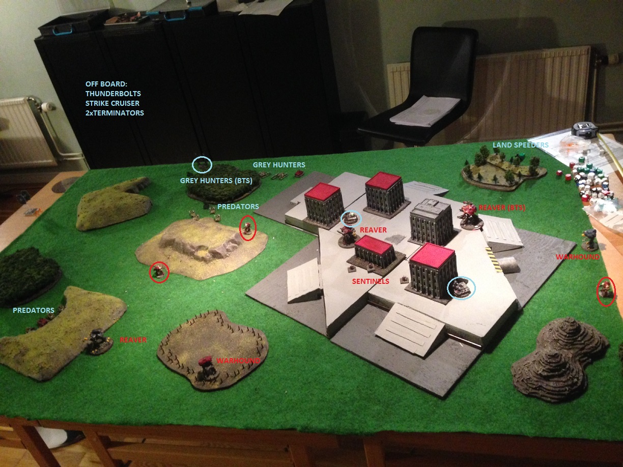 For setup i choose corner deployment and garrisoned the 2 formations of land speeders closer to the objectives. He set up strong with 2 reavers and 1 warhound on the far edge of his deployment zone on the long side of the table. The rest of his force where set up close to the blitz objective so it was hard to guess what goals he was going for beforehand...