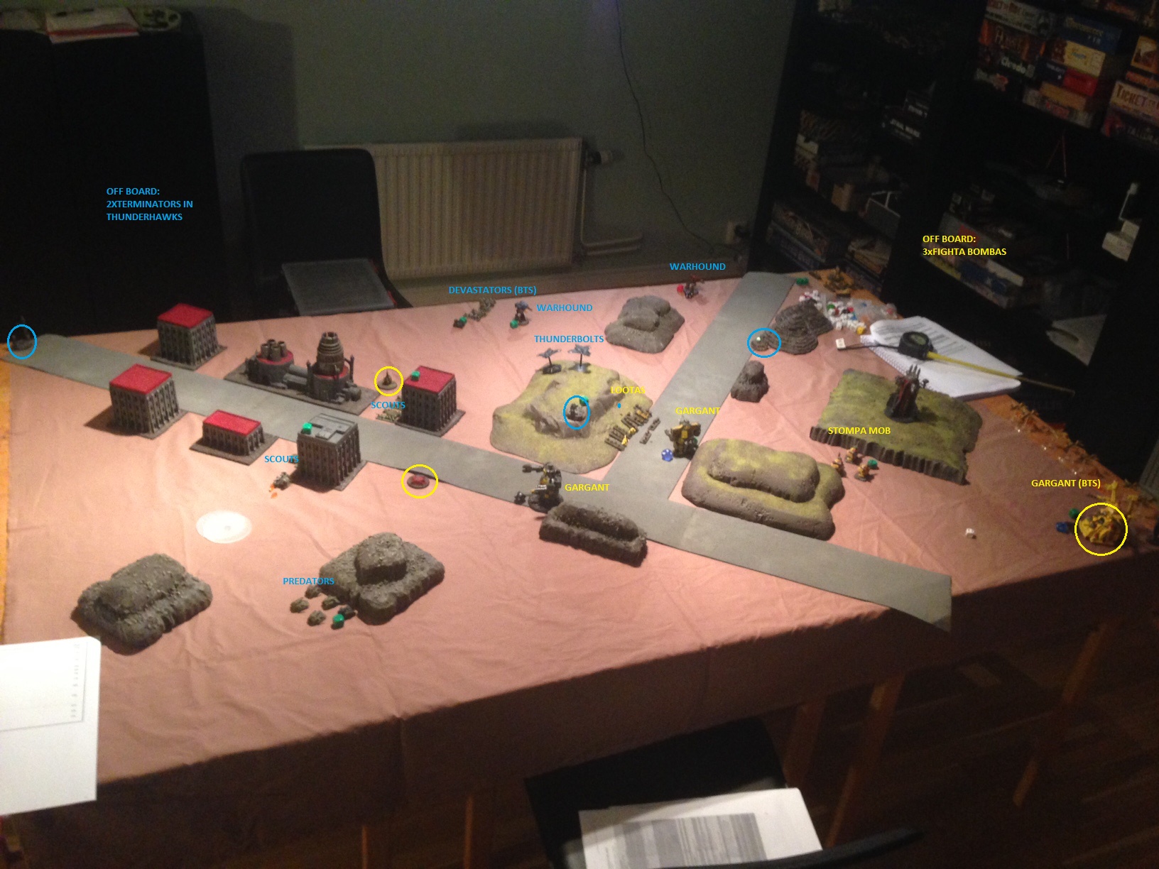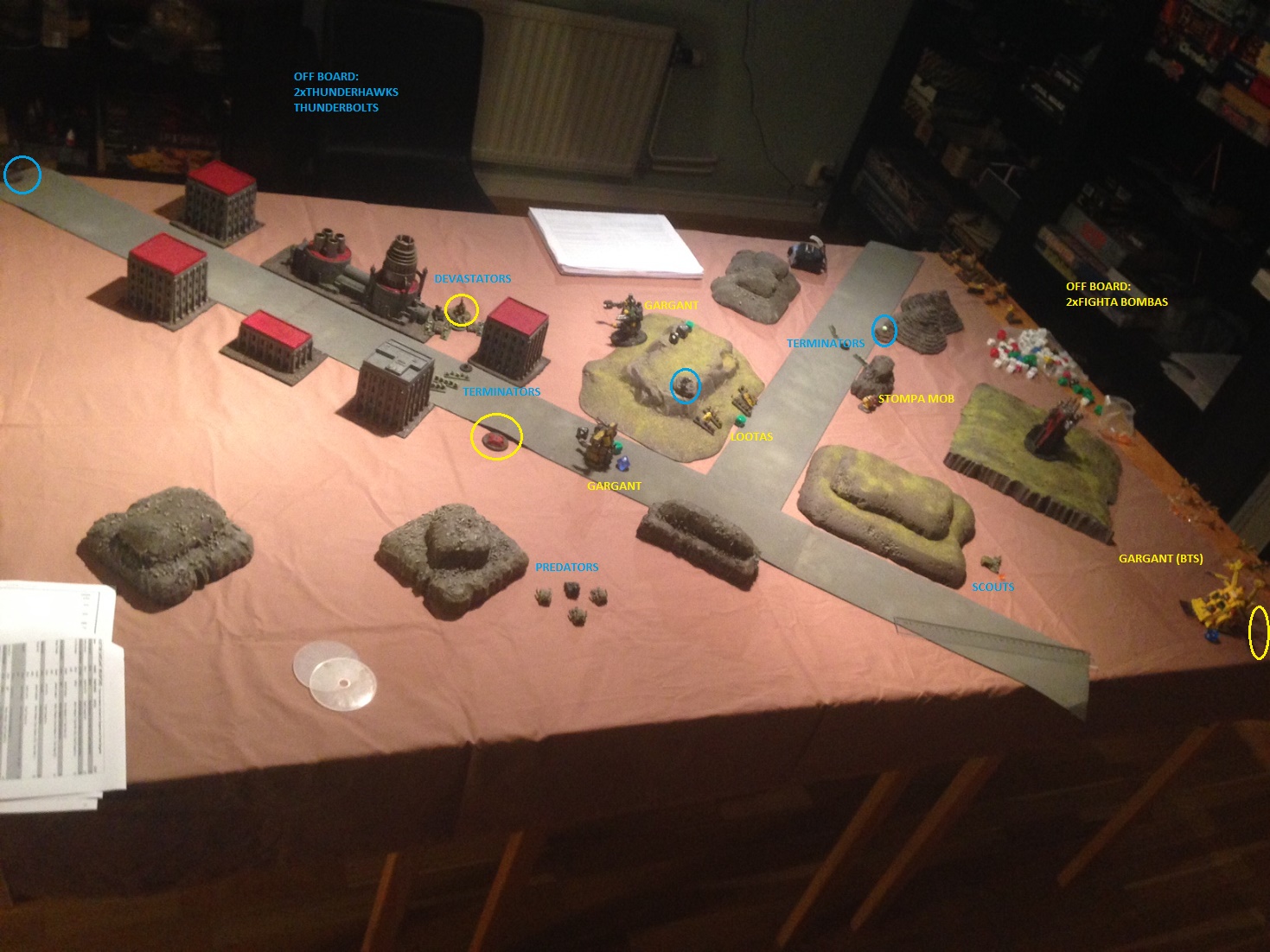 SM: scouts doubles and fires on stompa mob breaking it. SM: predators retain and sustain on gargant doing 2DC (3BM). O: fighta bombas ground attack scouts in building. hunter AA from devastators shots 1 of them down. the fightas only manage 1BM on the scouts. O: fighta bombas retain initiative and ground attacks warhound on right flank. they do 1DC which is a crit and the warhound is destroyed. SM: scouts sustain on lootas killing 1 stand of boyz (2BM). O: lootas doubles and spreads out to cover 2 objectives. they fire on scouts in building for 1BM. SM: terminators doubles to T&H objective. they fire on broken stompa mob killing 1 stompa due to BM:s. O: fighta bombas go on CAP. SM: thunderbolts ground attack lootas. 1 killa kan and 1 grot are killed (2BM). O: gargant engages scouts wiping them out for no losses. claims T&H. SM: empty thunderhawk ground attacks lootas killing 1 boyz and 1 grotz breaking the formation. O: Gargant by ork blitz advances and fires on scouts for 1BM. SM: devastators doubles up to T&H objective to deny the Orks T&H and to be in support range of the coming assault on the gargant. they fire on it for 1BM. SM: terminators in thunderhawk ground assaults gargant. fighta bombas intercept but are shot down by 2 hunter AA shots. terminators do 2DC on the gargant for no losses and wins the combat.