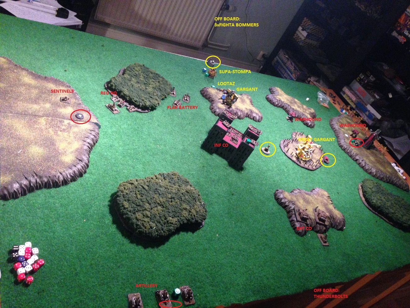 Stompa mob garrisoned on the right flank next to a forest. Lootas garrisoned behind a hill near the blitz. Inf Co garrisoned in the Battlescene design Guildhall of awesome in the middle.