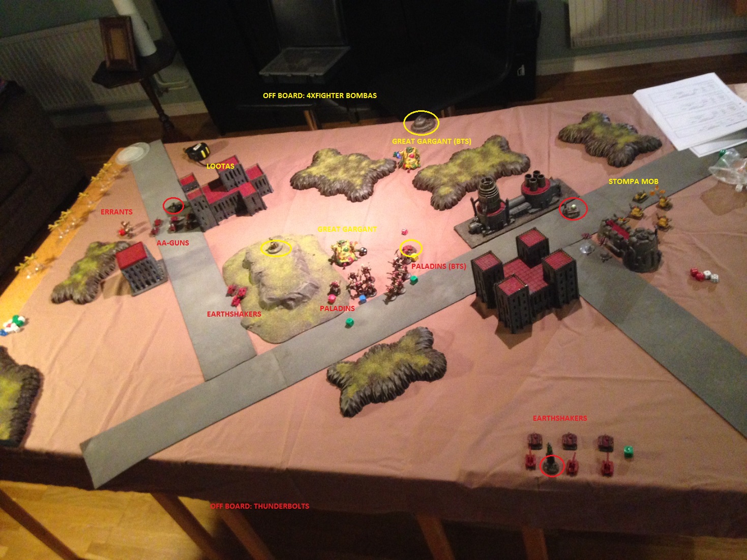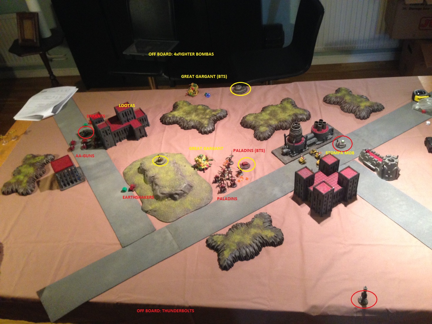 Both Great Gargant setup in the middle of the board. Stompa mob garrisoned behind a factory on the right flank. Lootas garrisoned behind a castle on the left flank.