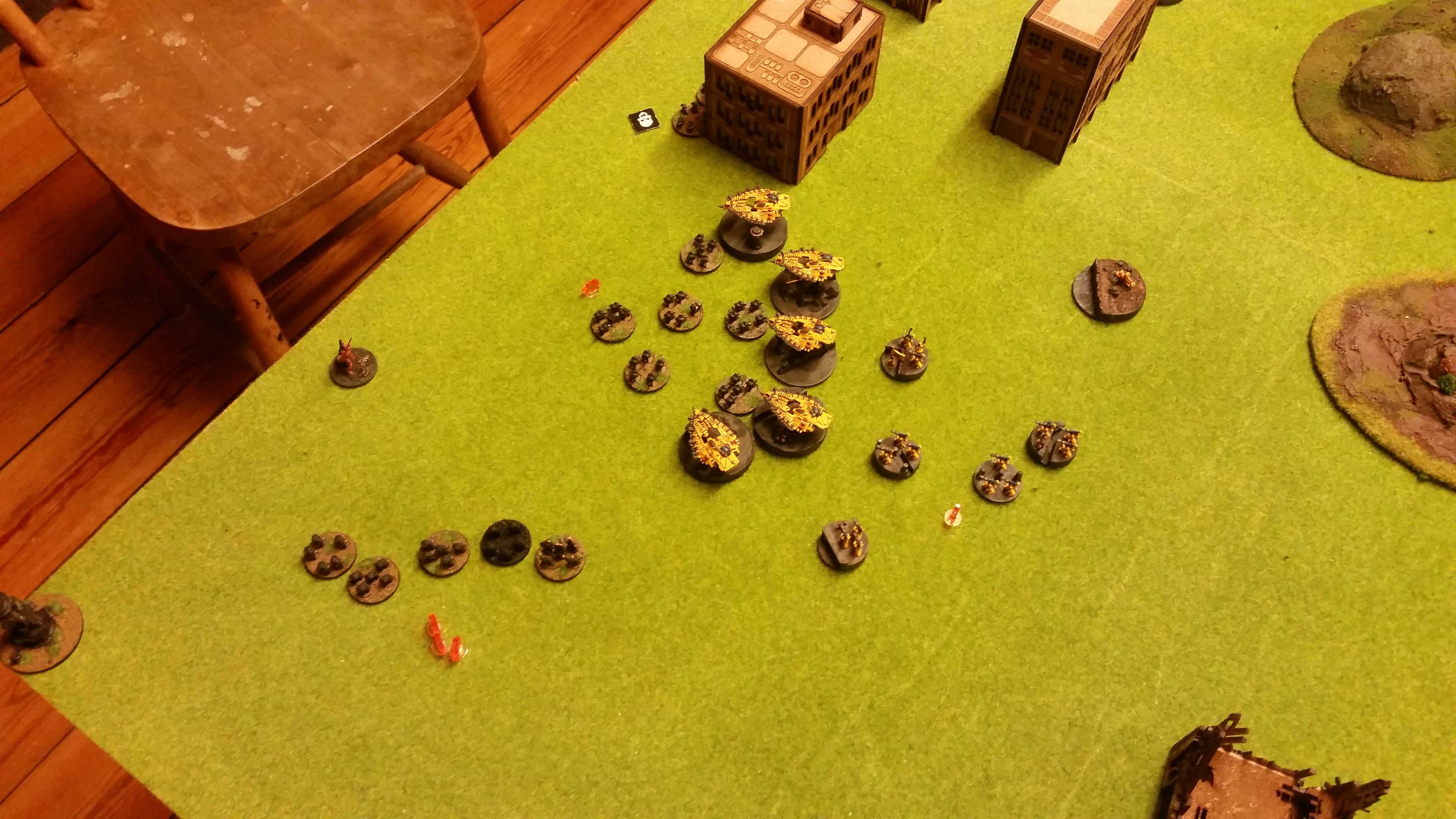 The Black legion tries to retaliate but only manages to kill a few here and there and a little bit later the Eldar spaceship activates and gets a lucky hit on one of the deathwheels (3TK hits = 2 shields and a crit…) The Wheel rolls in the retinue and the other is broken.