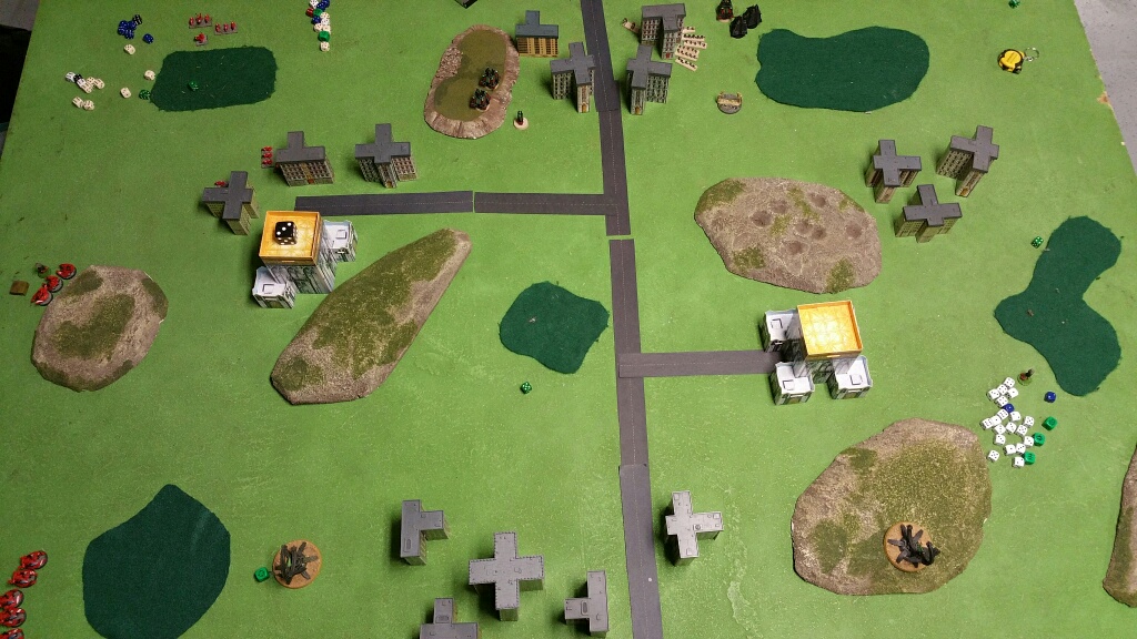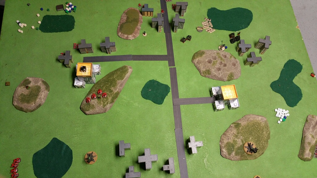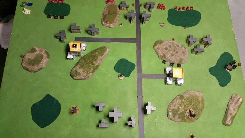 Both Blitz Objectives were placed centrally, the Necrons 2 objectives were placed within 30cm of the Saim Hann Blitz (plan was to dominate that area and minimize speed disadvantage). The Eldar objects were placed at the middle of the table, one at each edge (plan was to use Eldar mobility to take these objectives at end of game and play to Necron maneuverability weakness).