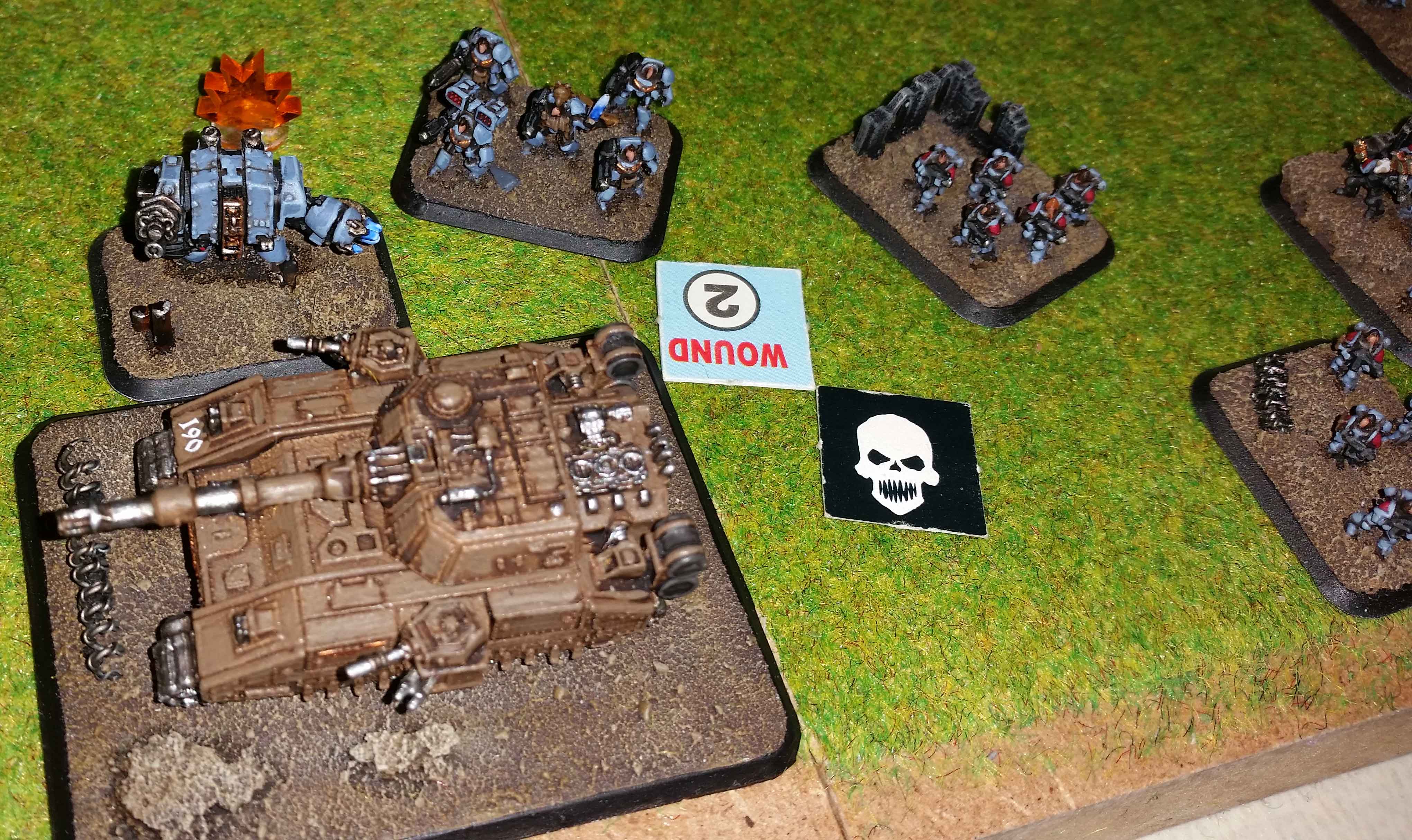 Spaceship bombards the landing zone, killing a tank and a Hydra (making the formation flee). The pods land and kills a sentinel (making the other flee, killing one in the process.) The marines jump out and the Wolf guard terminators take on the tank company. After a tight fight without much losses the Wolf guard is in the lead with one for the roll-off. The Wolves manage to win with a devastating 6-2 so the entire tank company is destroyed in hackdown and for not being able to flee far enough (the commissar was killed in the fight.)