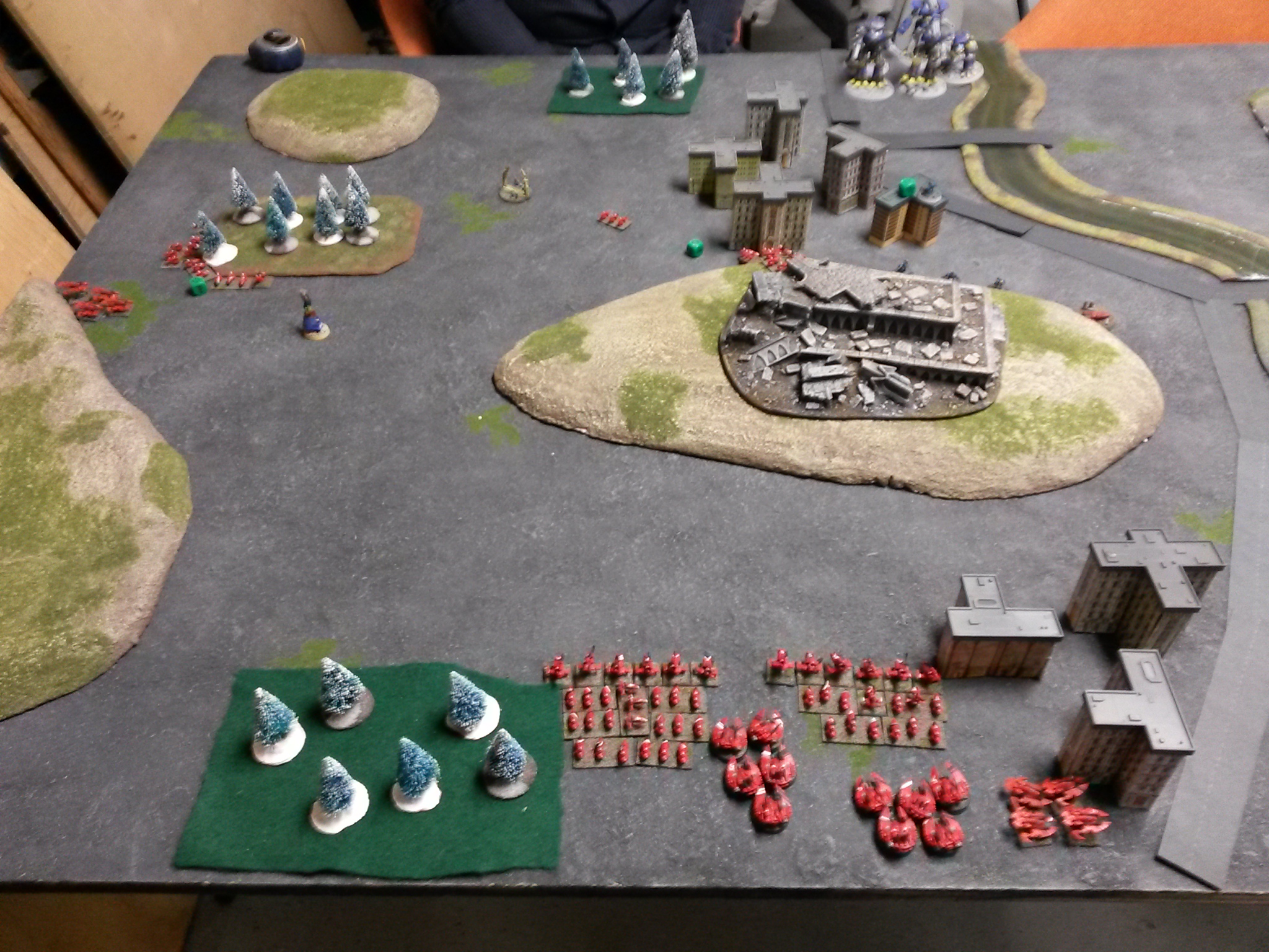 GARRISON: - Eldar garrison Scout Troop #1 behind woods near table edge off objective out of LOS of ATML deployment zone. - ATML garrison Crusader Maniple off middle objective and behind hill and out of LOS of Eldar deployment zone. - Eldar garrison Scout Troop #2 off middle line objective with bulk of troop between buildings and hill with LOS to Crusaders Maniple (most within 15cms), 1 jetbike in LOS of ATML deployment to enable stretch