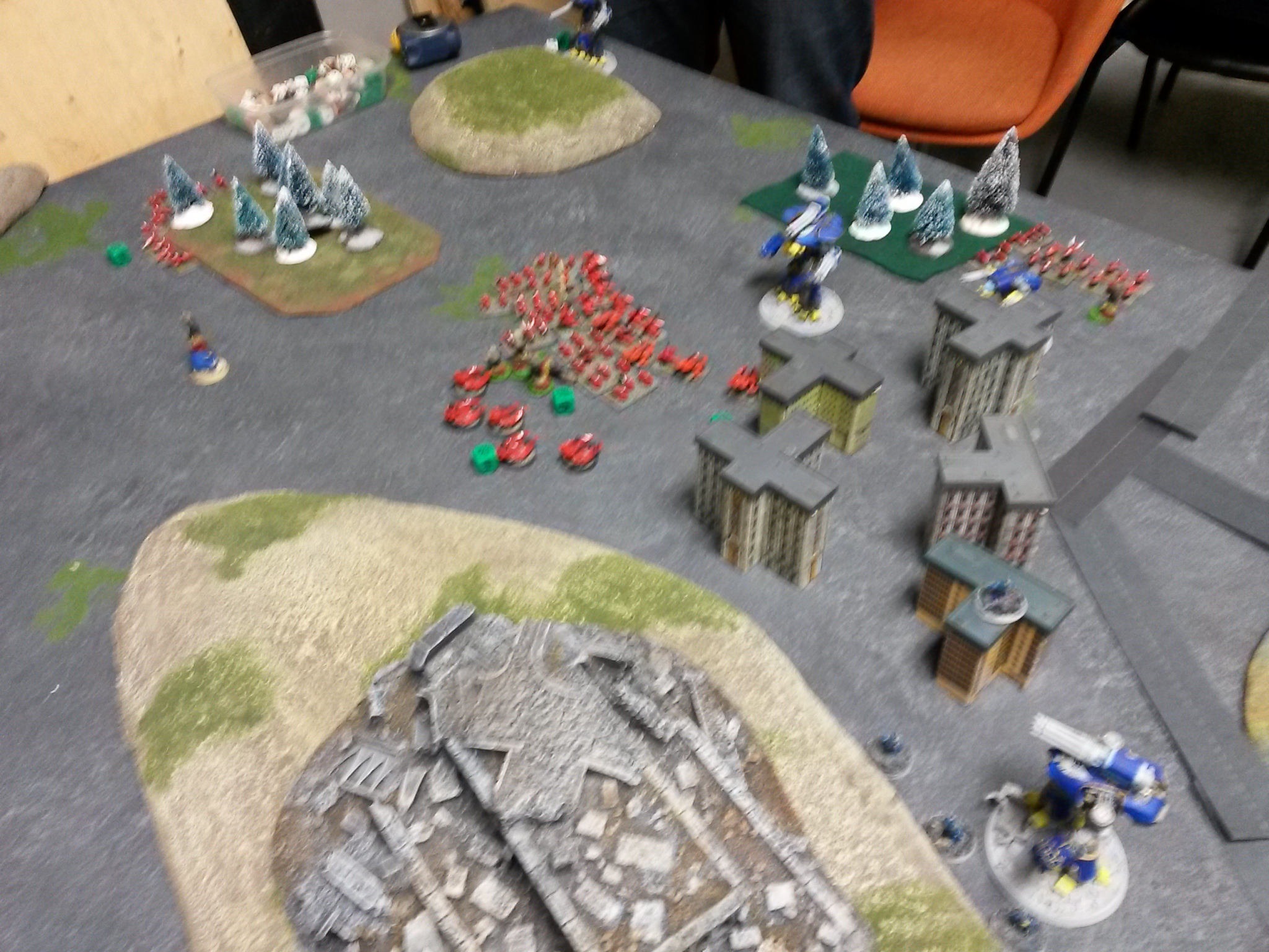 ATML – Warhound #1 Doubles, shoot Scout Troop #2, kill 2, 3 blast Scout Troop #2 Overwatch and down 1 void shield, 1 blast on Warhound #1 Eldar – Sword of Vaul #1 Advance, Pop Up from behind hill, staying 30cm away from Crusader Maniple (to avoid Overwatch) and shoot Warhound #1 and down 1 void shield, 1 blast on Warhound #1 ATML – Reaver #1 doubles and shoots Scout Troupe #2, kills 2, breaks unit. Crusader Mantiple Overwatch shoot Scout Troupe #2 and destroy unit Eldar – Hornets #1 Doubles and shoots Warhound #1, (3 hits, 2 save) 1 DC damage and breaks unit. ATML – Reaver #2 Doubles and shoots Hornets #1 in cover, no hits, 1 blast ATML – RETAIN with Reaver BTS, Double and fail, use SC reroll and base Double, shoot Hornets #1, kill 2, break Hornets Eldar – Hornets #2 Double, shoot Reaver BTS, 4 shields down, 1 blast ATML – Thunderbolts #1 Ground Attack Scouts Troup #1, 1 blast Eldar – Wild Rider SC Double to withing supporting fire of Reaver BTS and shoot Reaver BTS, 1 blast ATML – Warhound #2 Moves and Shoots Wild Rider BTS, kills SC and 2 vypers, 4 blast Eldar - Sword of Vaul #2 Doubles and shoots Reaver BTS, 3 hits 1 DC damage, 2 blast ATML – Thunderbolt #2 Ground Attack, ground AA shoots down one Thunderbold (2 blast), kill 1, 2 blast Eldar – Wild Rider #2 Double (into support fire range of Reaver BTS) and shoot Reaver #2, no hits, 1 blast Eldar – Scout Troupe #1 Fail activiation, Hold and Marshall removing all blast markers Eldar – Wild Rider BTS fail Engage out of Wraithgate, Hold and marshall, removing blast Eldar - Shinning Spears Engage out of Writhgate Reaver BTS, 3 DC on Reaver BTS with the help of Supporting Fire, Reaver BTS Broken, Shinnig Spears take 2 casualties and 2 blast, Reaver #2 takes 1 blast for supporting