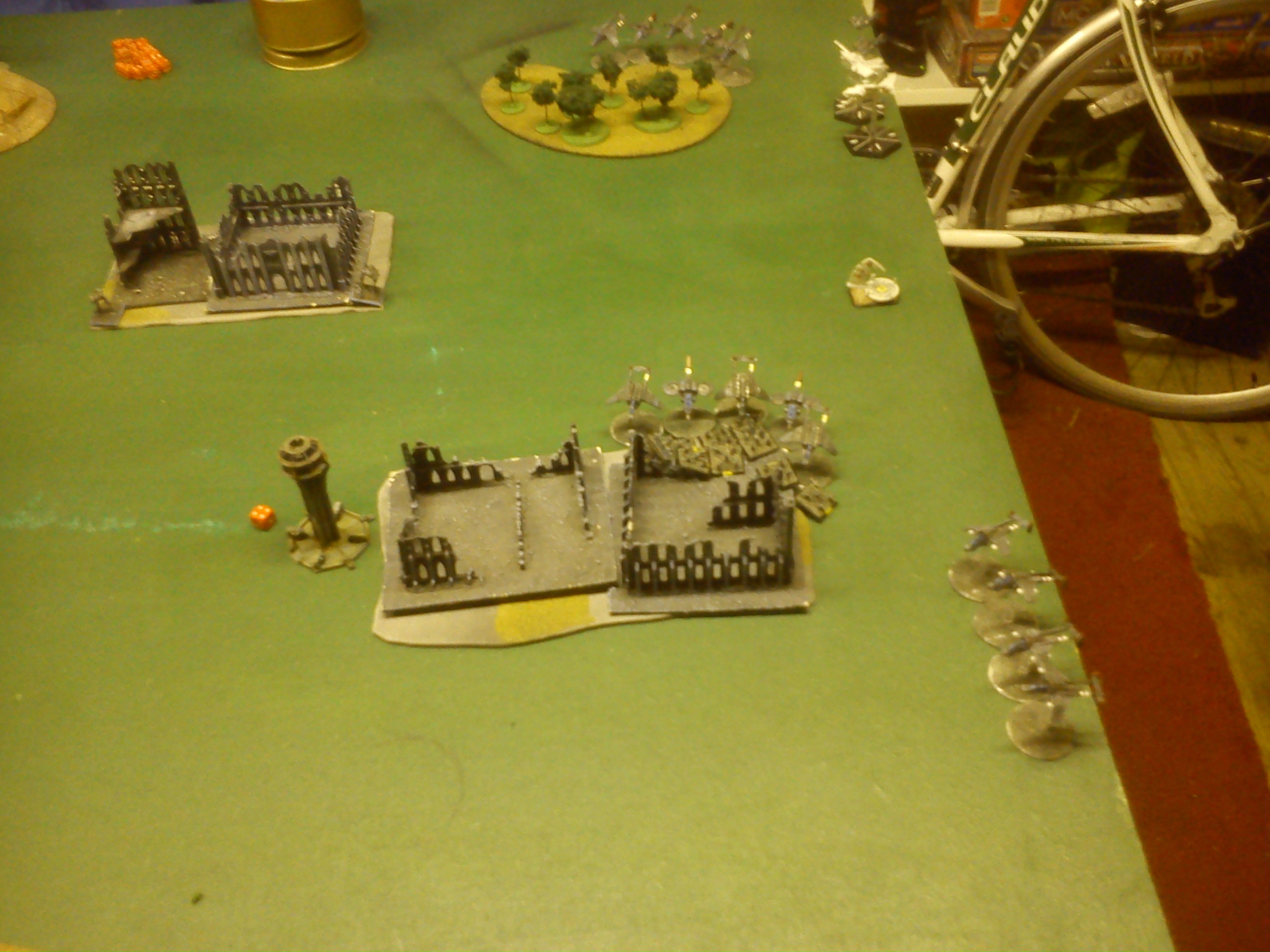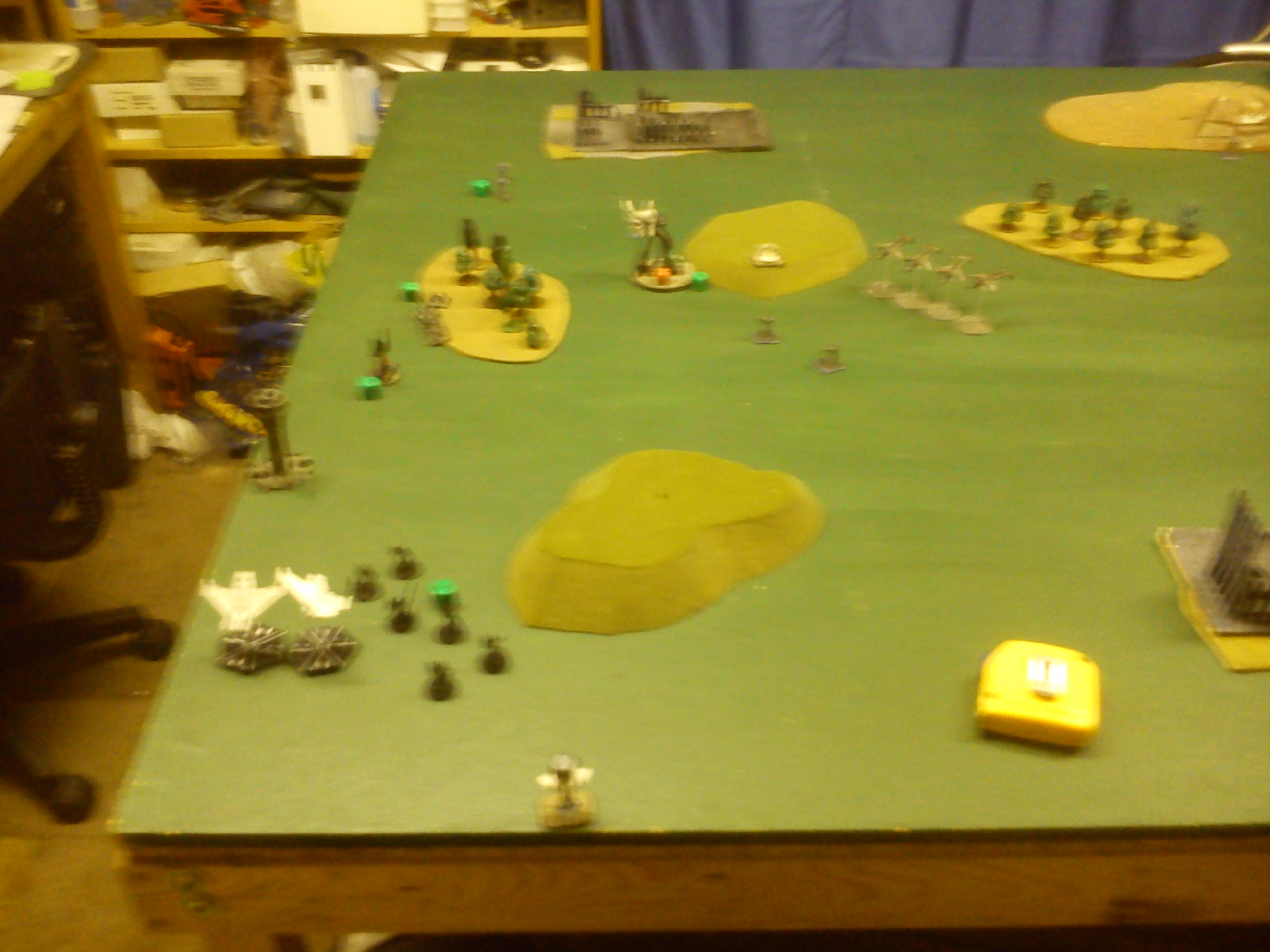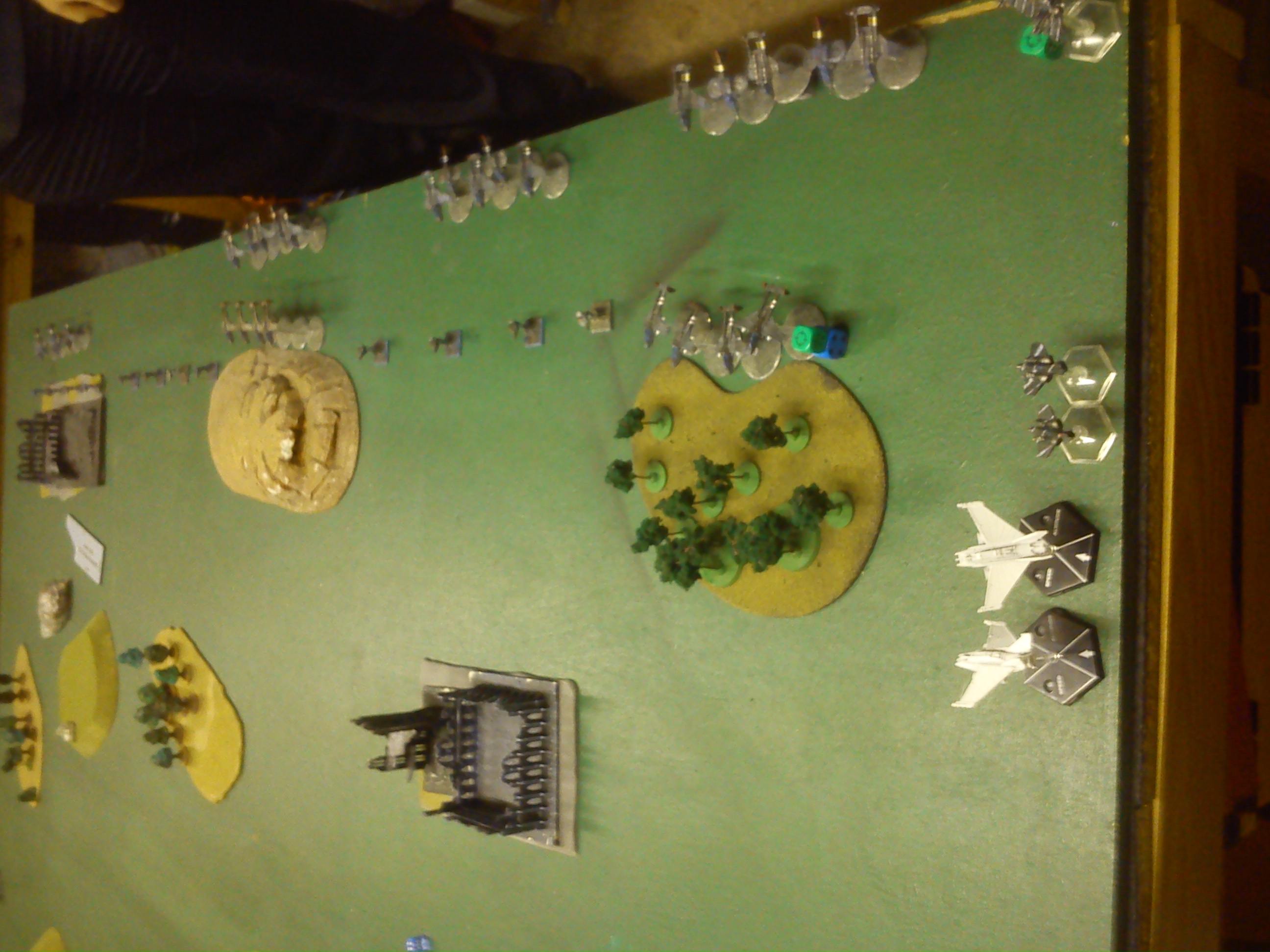 Turn 1, eldar win I started of with planes on CAP and tim put other vultures on overwatch popped up, then my warwalkers and wraithlords on overwatch. Tim's sentinels move up into cover, my titan move up using cover from vultures and break a sentinel formation, my revenant moves up on flank. After I'm done Tim moves the rest air cavalry into crossfire positions and other set of vultures double up and splat single revenant.