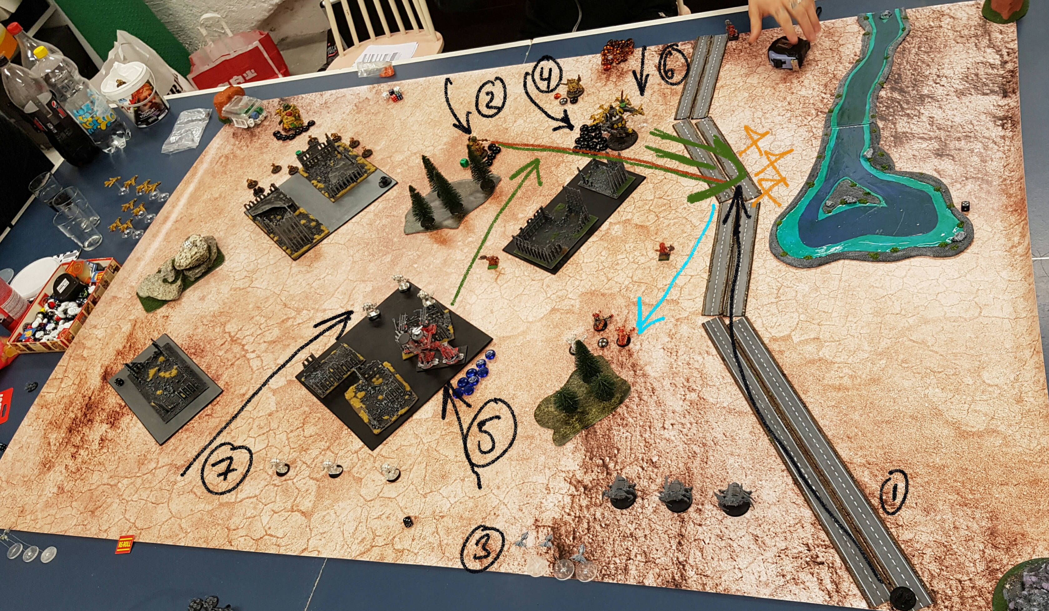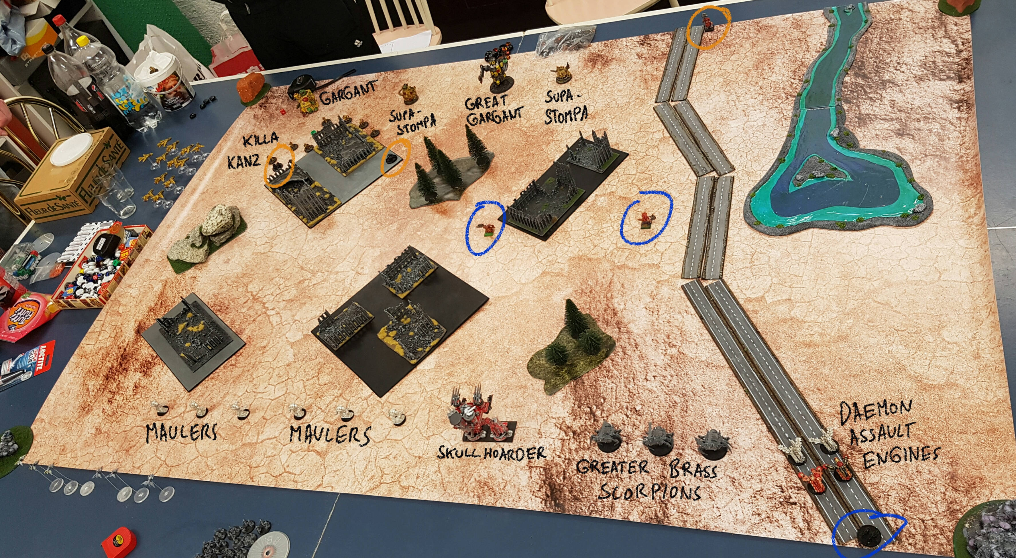 The second Supa Stompa (5) sustains fire at the Daemonic Assault Engines, breaking them. The unit retreats forwards. The Great Gargant (no number, should be 6) heads towards the road, shoots at the Daemon Engines, and kills two of them.