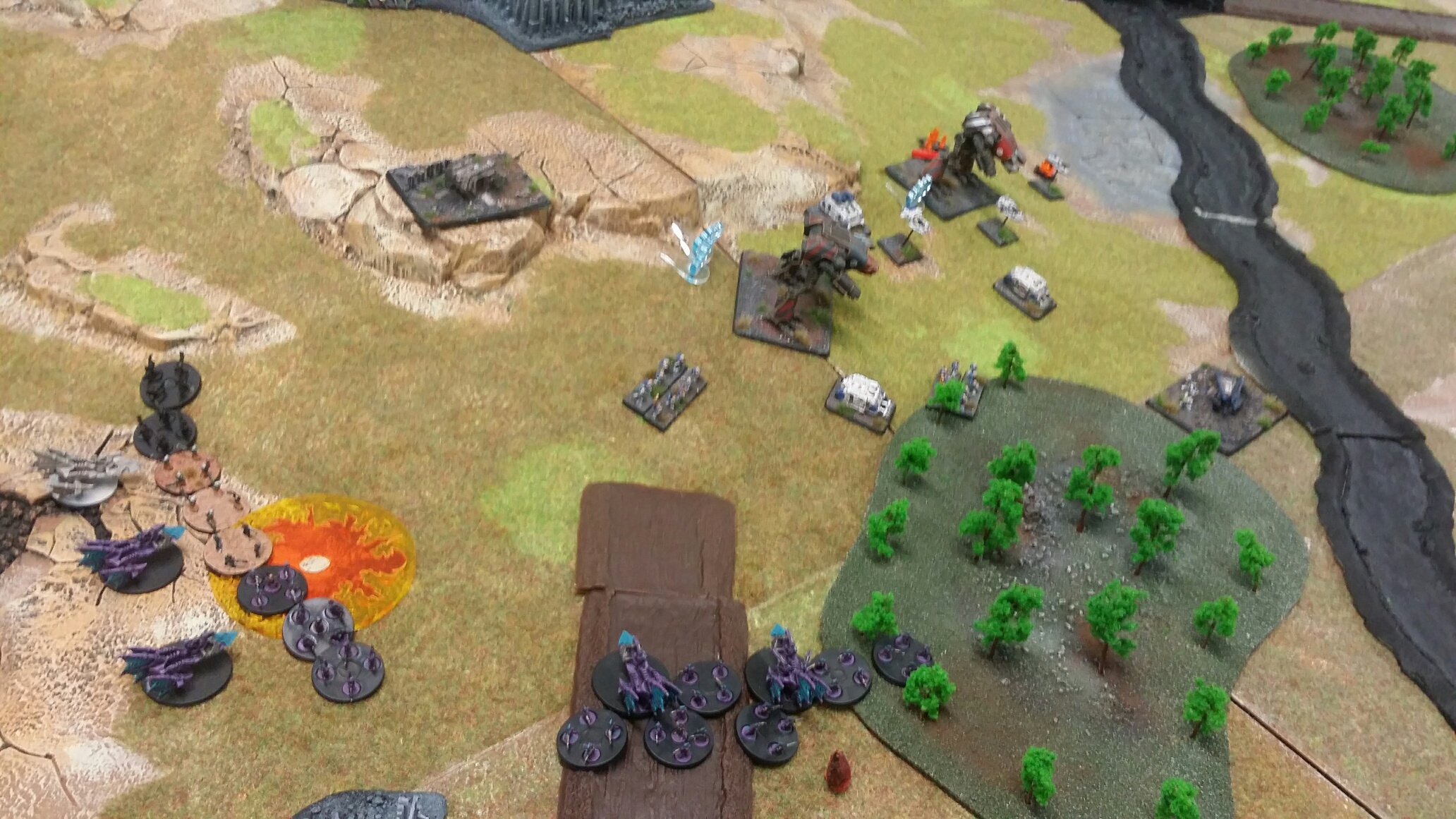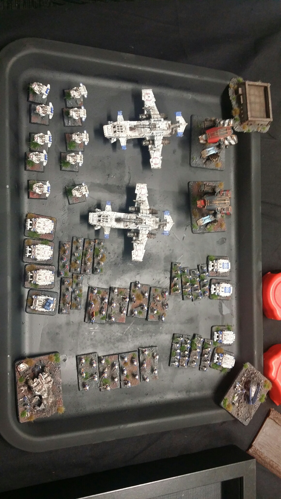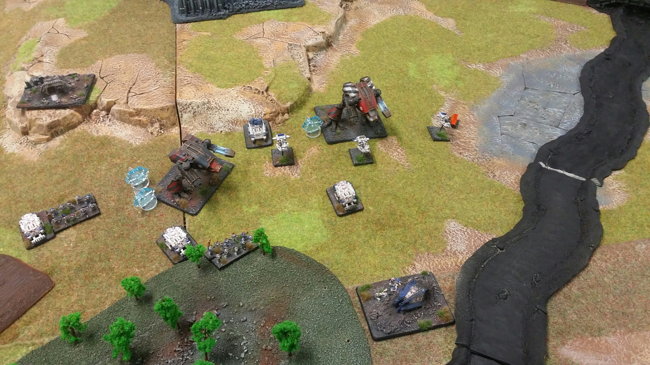 Turn 1. Marines win priority give to DE DE activate Space craft. Space craft kills 2 marines, 3 BMs on the marines and 1 bm on the warhound. Pin point strips 2 shields and 1 bm on the warhound DE retain Fails to CAP razor wings. Marines double with Landspeeders to shore up marine right flank. DE fail to cap second razor wings. Scouts on blitz go on overwatch. Warriors double and shoot speeders. DE retain and launch warriors from the webway to engage the intermingled speeder formation with another warrior syndicate in support. 1 raider killed, 2 speeders killed. 2 die from spt fire. Marines loose combat by 6. Breaks both speeder formations. Titans double. Shoot at warriors in cover on the obj. kill 3 raiders and 1 inf. Warrior formation broken. Withdraws to cover.