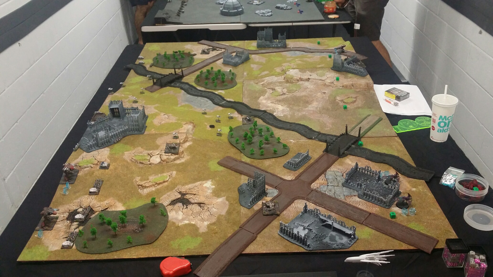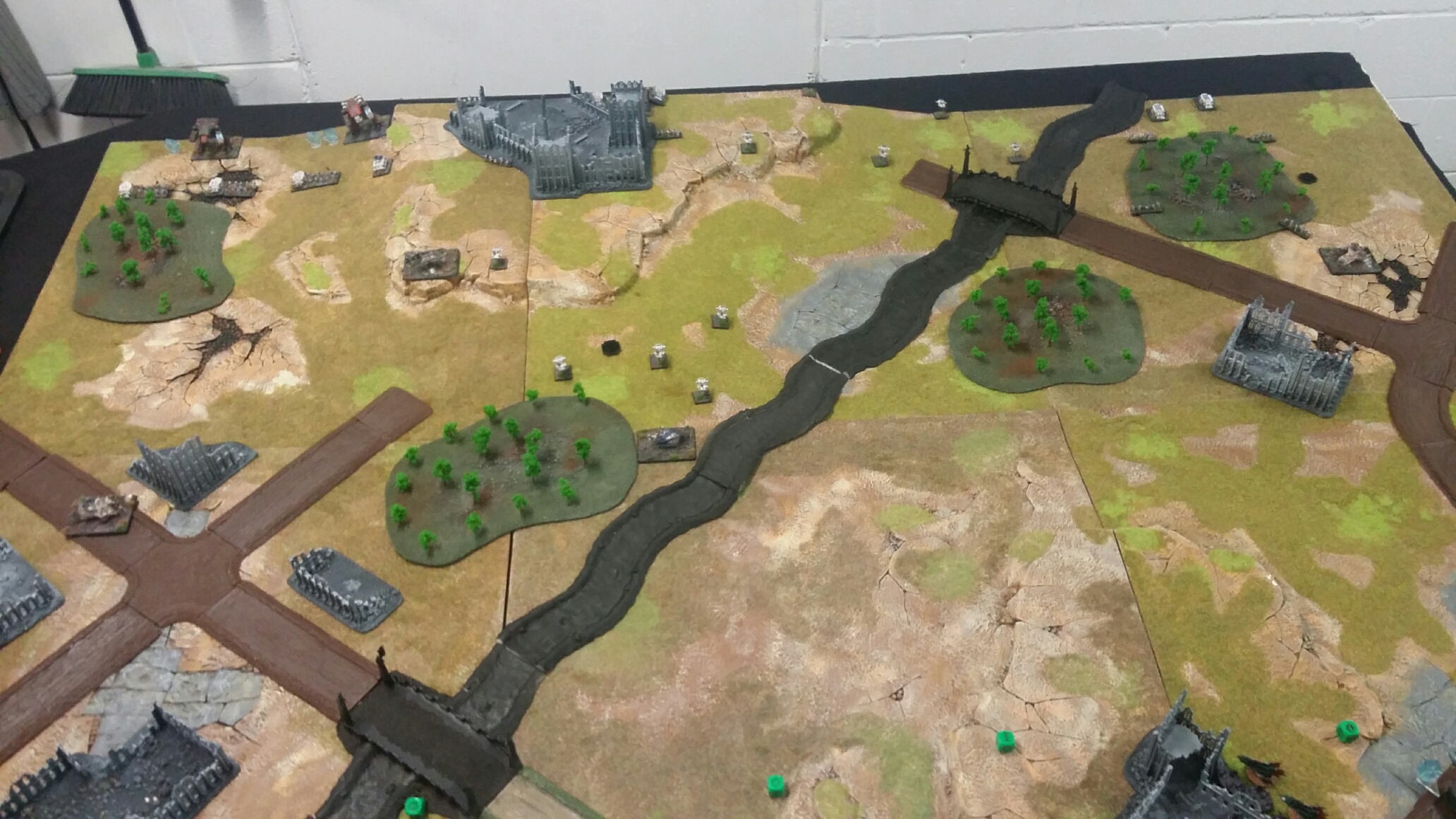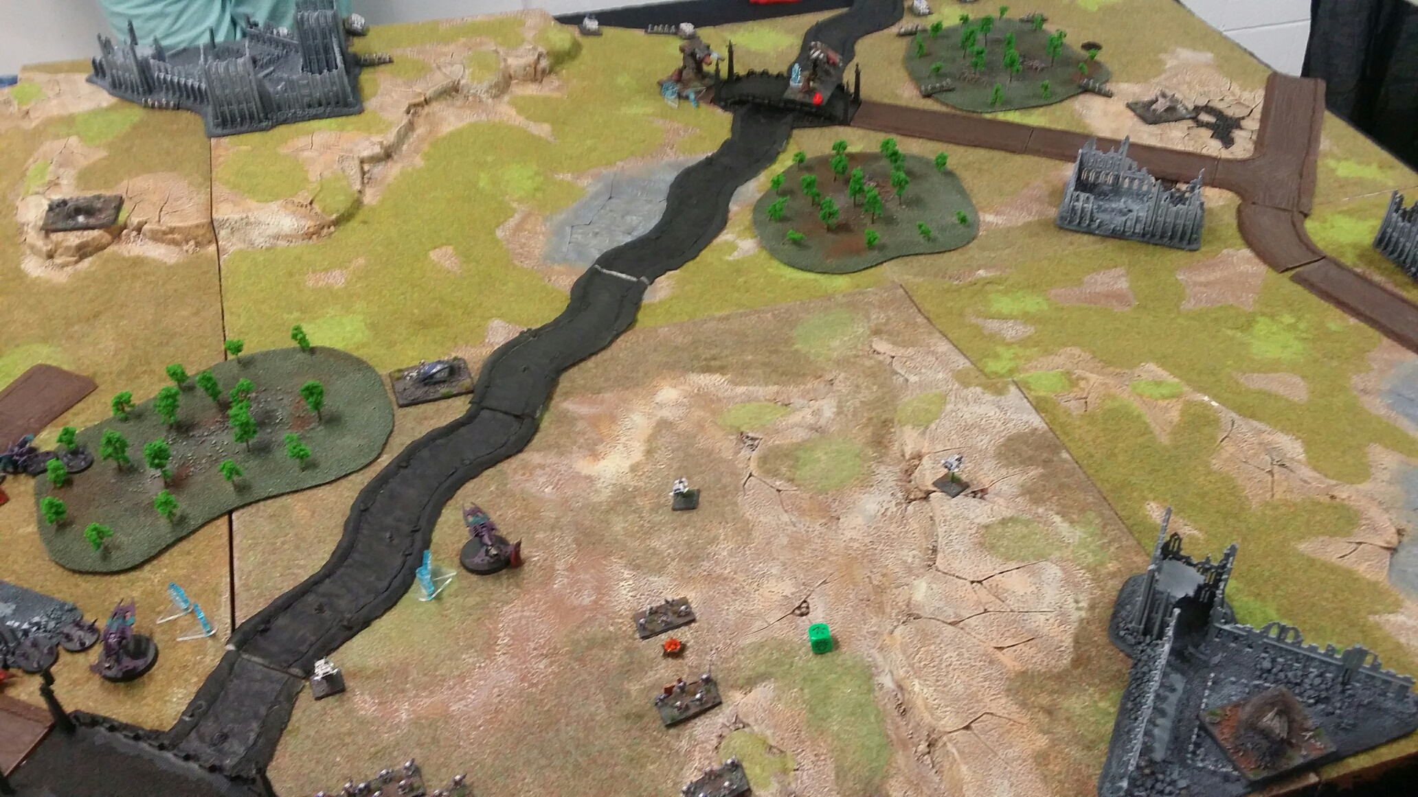 Turn 1. Marines win priority give to DE DE activate Space craft. Space craft kills 2 marines, 3 BMs on the marines and 1 bm on the warhound. Pin point strips 2 shields and 1 bm on the warhound DE retain Fails to CAP razor wings. Marines double with Landspeeders to shore up marine right flank. DE fail to cap second razor wings. Scouts on blitz go on overwatch. Warriors double and shoot speeders. DE retain and launch warriors from the webway to engage the intermingled speeder formation with another warrior syndicate in support. 1 raider killed, 2 speeders killed. 2 die from spt fire. Marines loose combat by 6. Breaks both speeder formations. Titans double. Shoot at warriors in cover on the obj. kill 3 raiders and 1 inf. Warrior formation broken. Withdraws to cover.