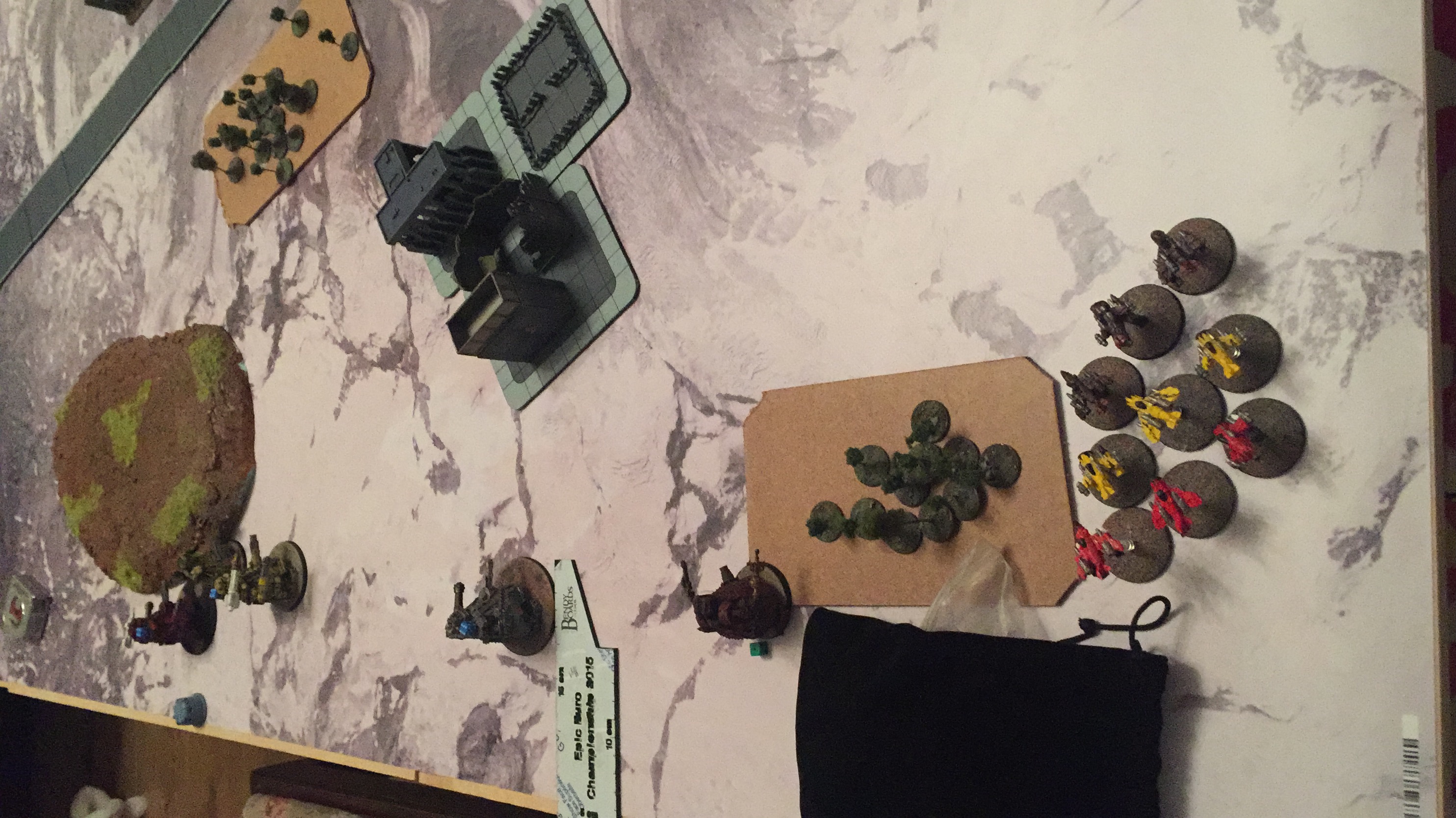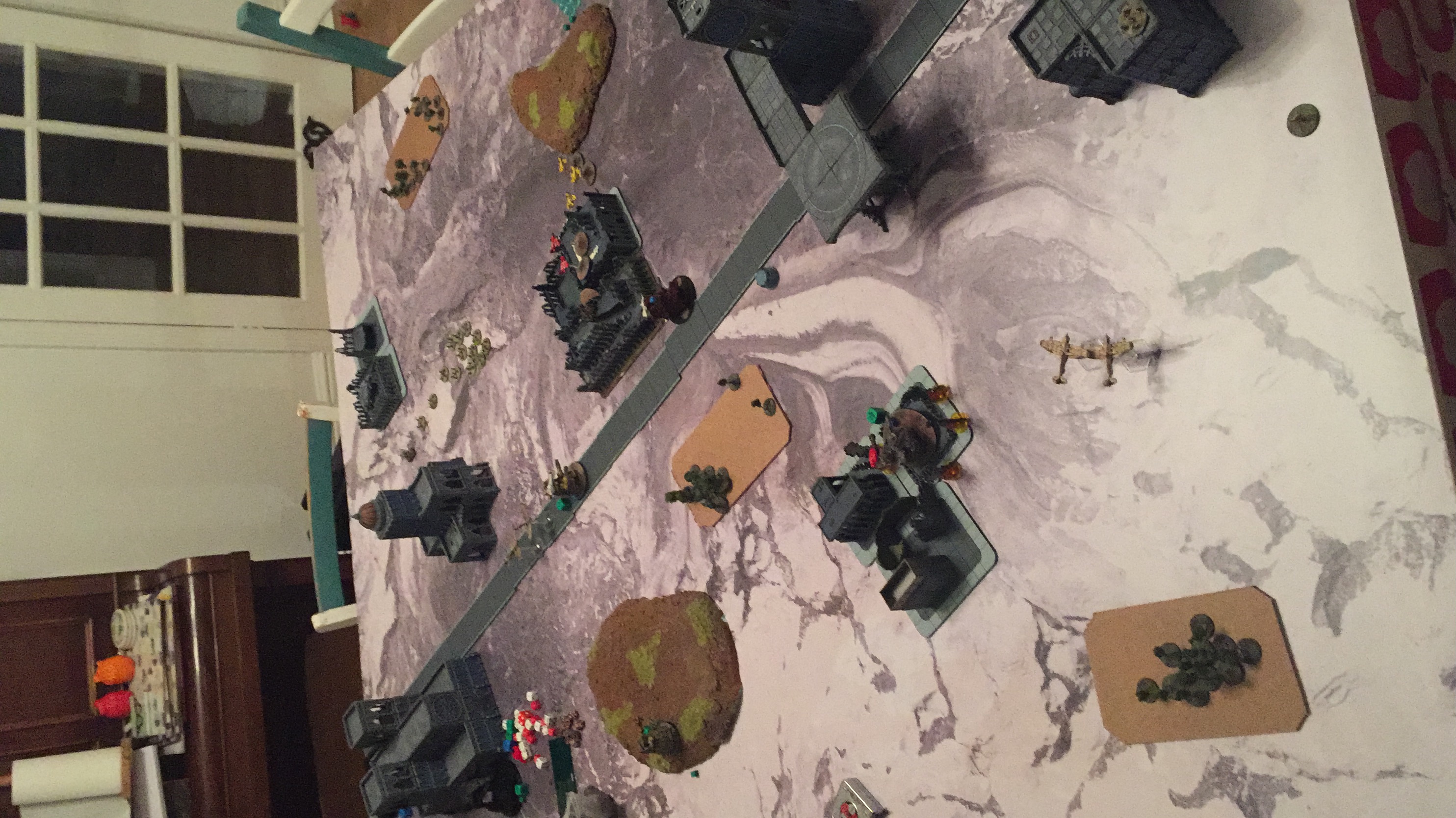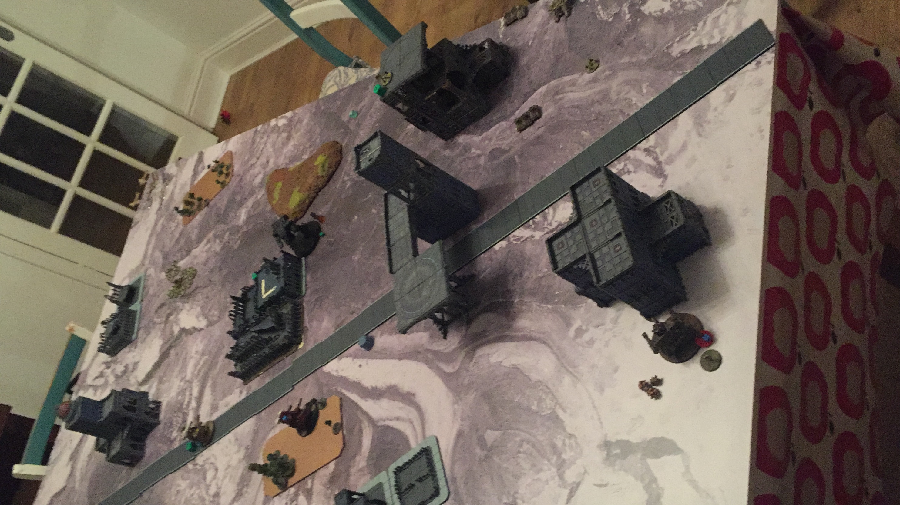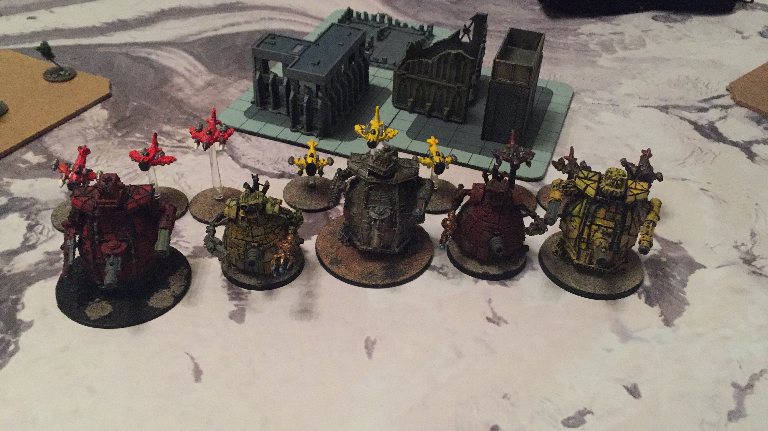 Orks break the Warhound. Guard break the central Gargant, 2 wounds left, which runs away. Gargant comes out of cover on right flank to try and destroy the Shadowsword, it fails. Guard pushes forward to get into Orks half and claim an object. Orks go after BTS with aircraft. Lone infantry stand contests objective with Gargant on right flank. Hydras fire on Gargant. Orks go after BTS with aircraft. Thunderbolts fire on gargant. Orks go after BTS with aircraft. Basilicks fire on Gargant. Shadowsword fires on Gargant and reduces it to one wound.