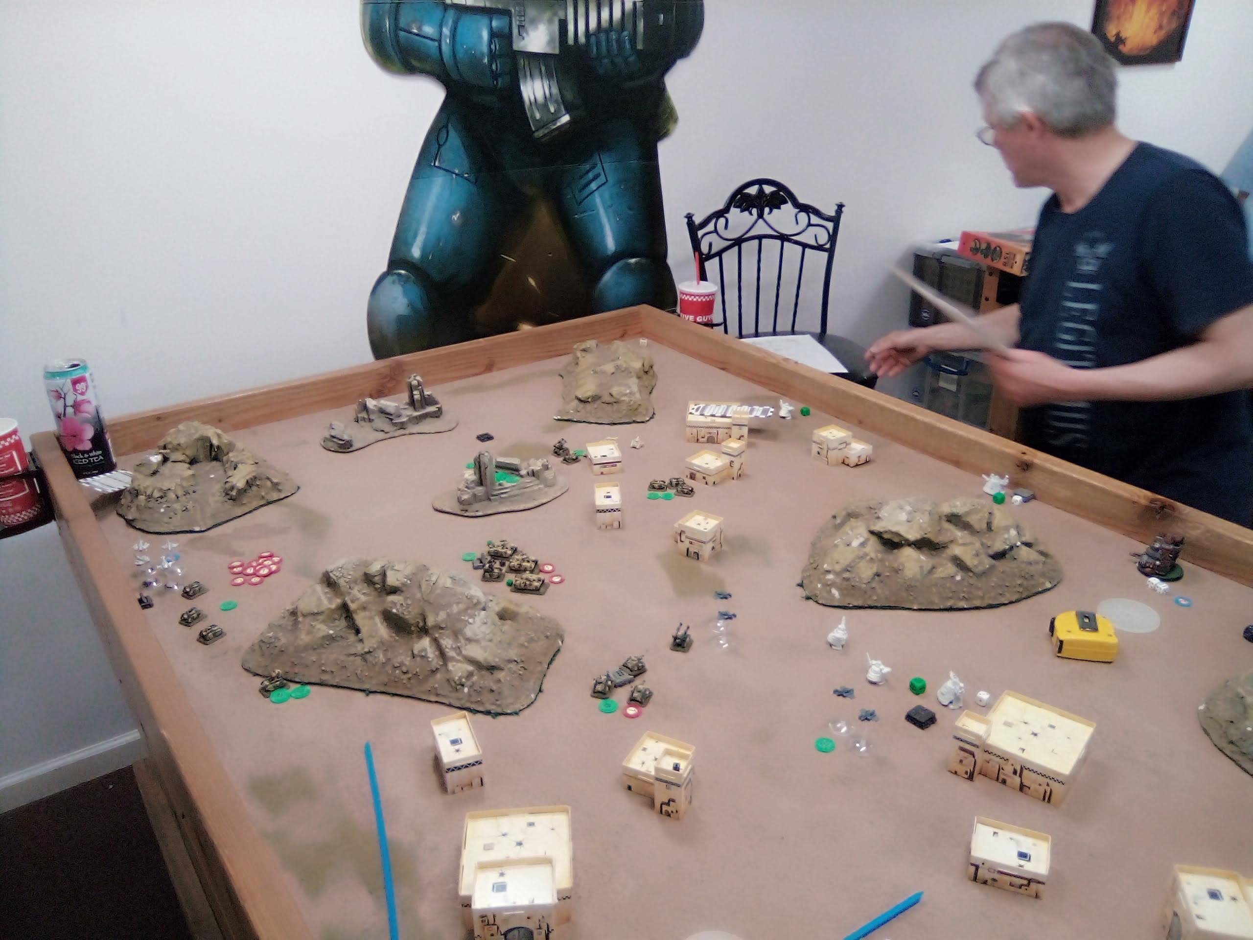 Turn 3 saw the Orks win strategy again, but the Baneblades shrugged off most of the damage. Vultures and Salamanders managed to keep the Ork's right broken and grab Blitz, which forced the Great back to deny. With an offensive win not happening, the Guard switched gears and piled on to the Gargant which was destroyed just barley from everything the Guard could throw at it. Fgithas managed to break the Manticores while Salamanders doubled to grab DTF.