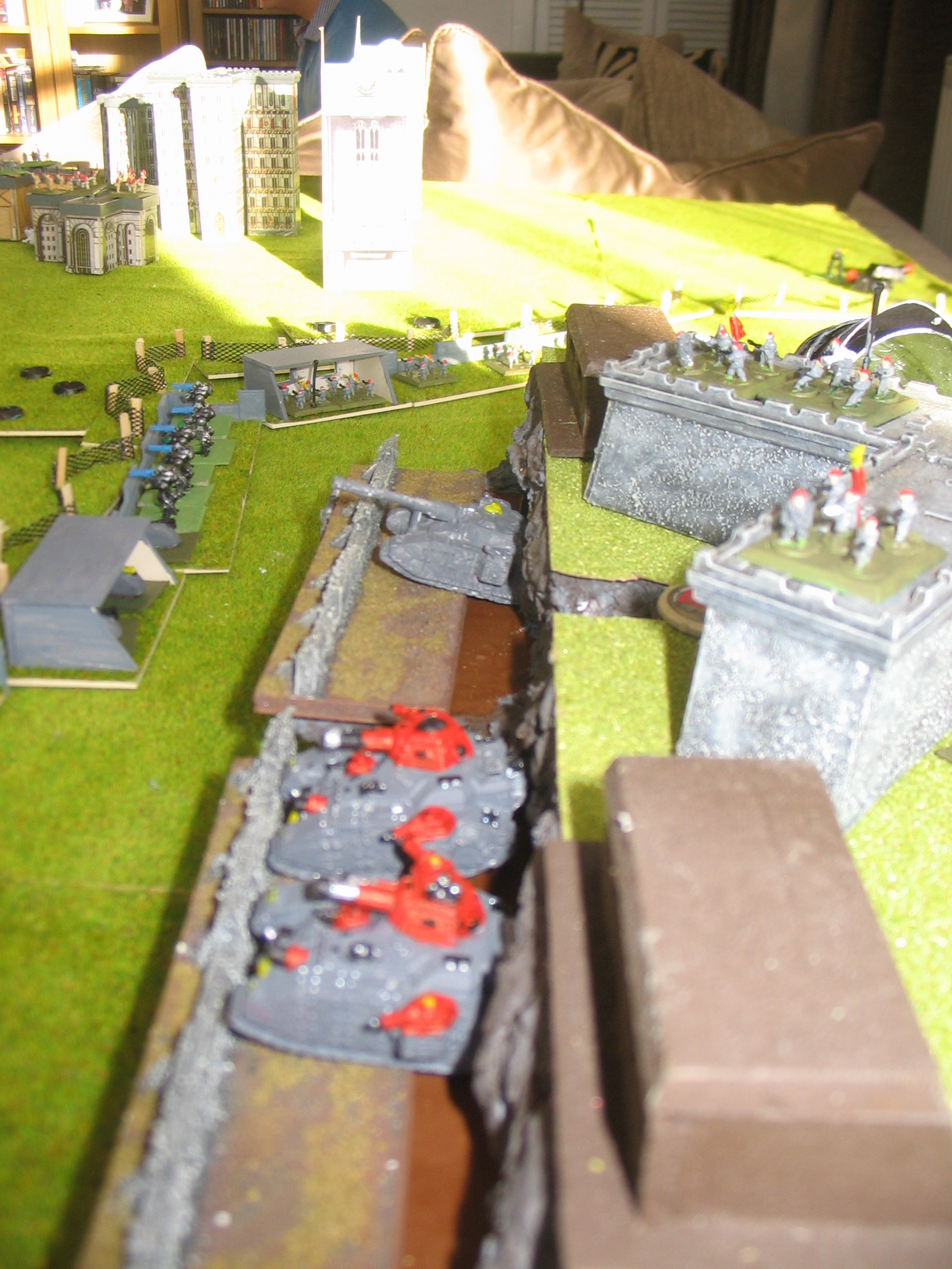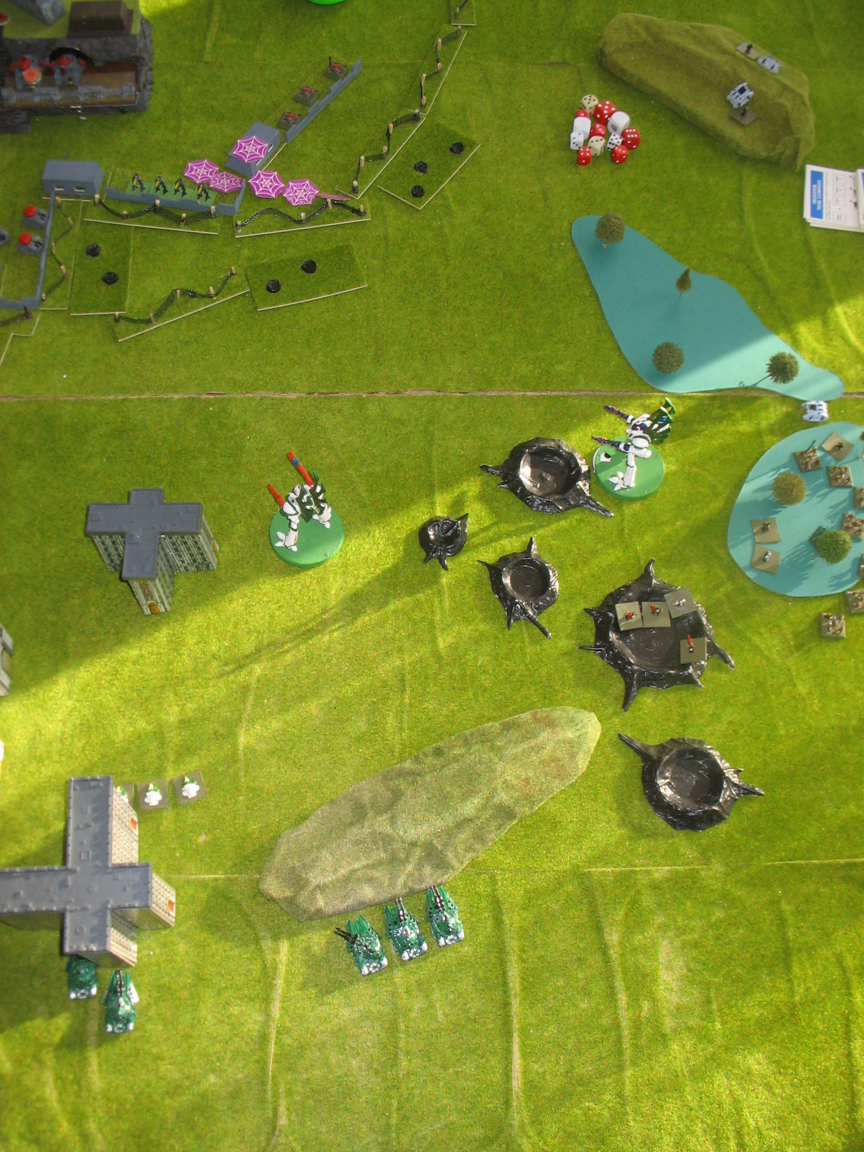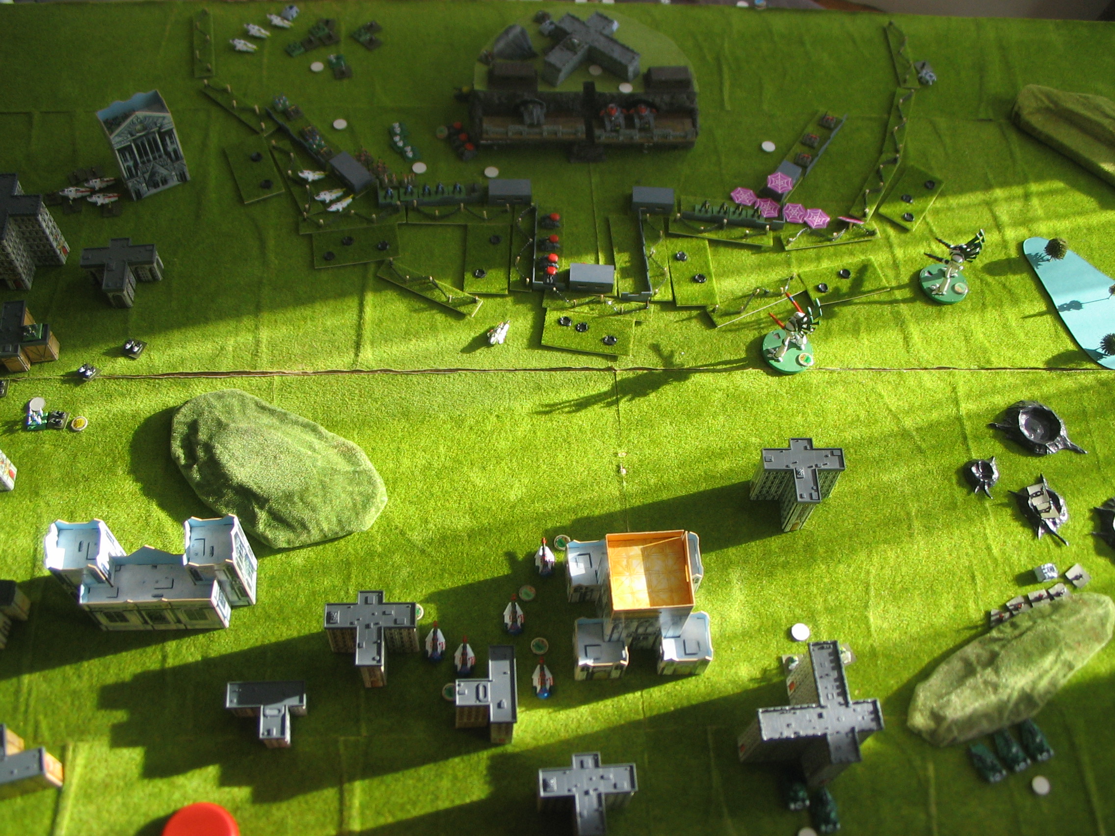 Dawn breaks to reveal that the Eldar Guardians are now completely decimated. Rough riders and bikes continue to engage Jet Bikes and Swooping Hawks but the Eldar Grav Tanks carrying the close-combat specialists are now readying themselves to breach the IG's outer defences.