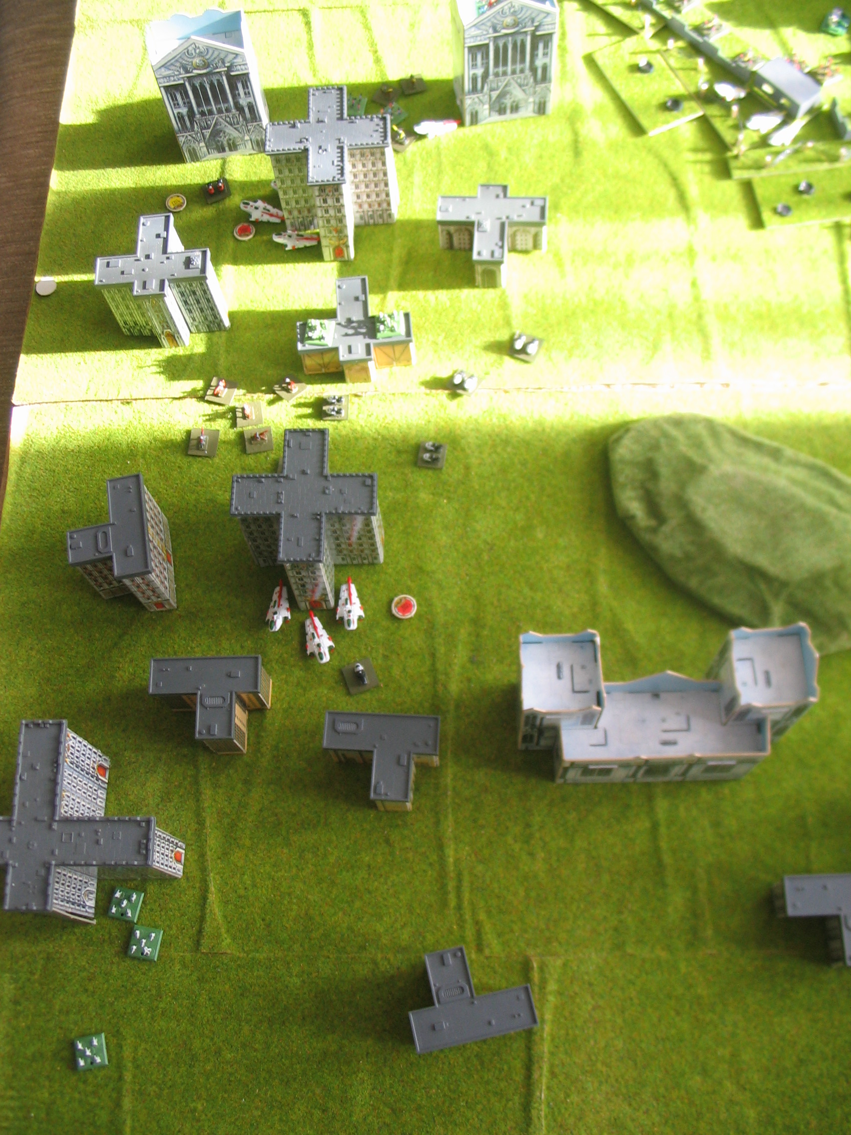 Another Shadowsword has been destroyed, but an exposed Tempest which has popped up, crashes and burns as it is blown out of the sky! The Warlock pays the price for being the nearest unit to the Imperial Guard defences. Despite taking cover in a building, he is killed by Sentinel fire.