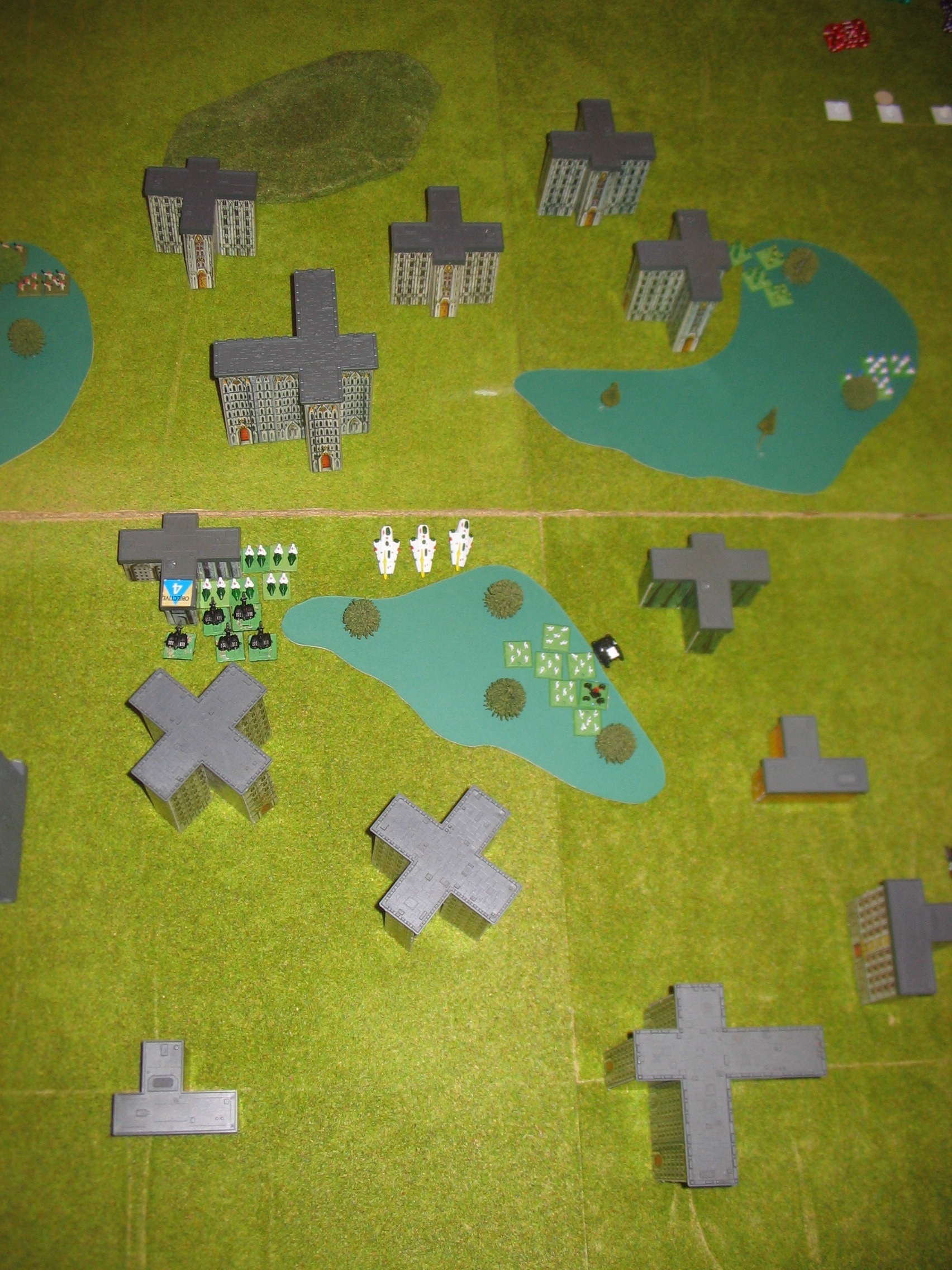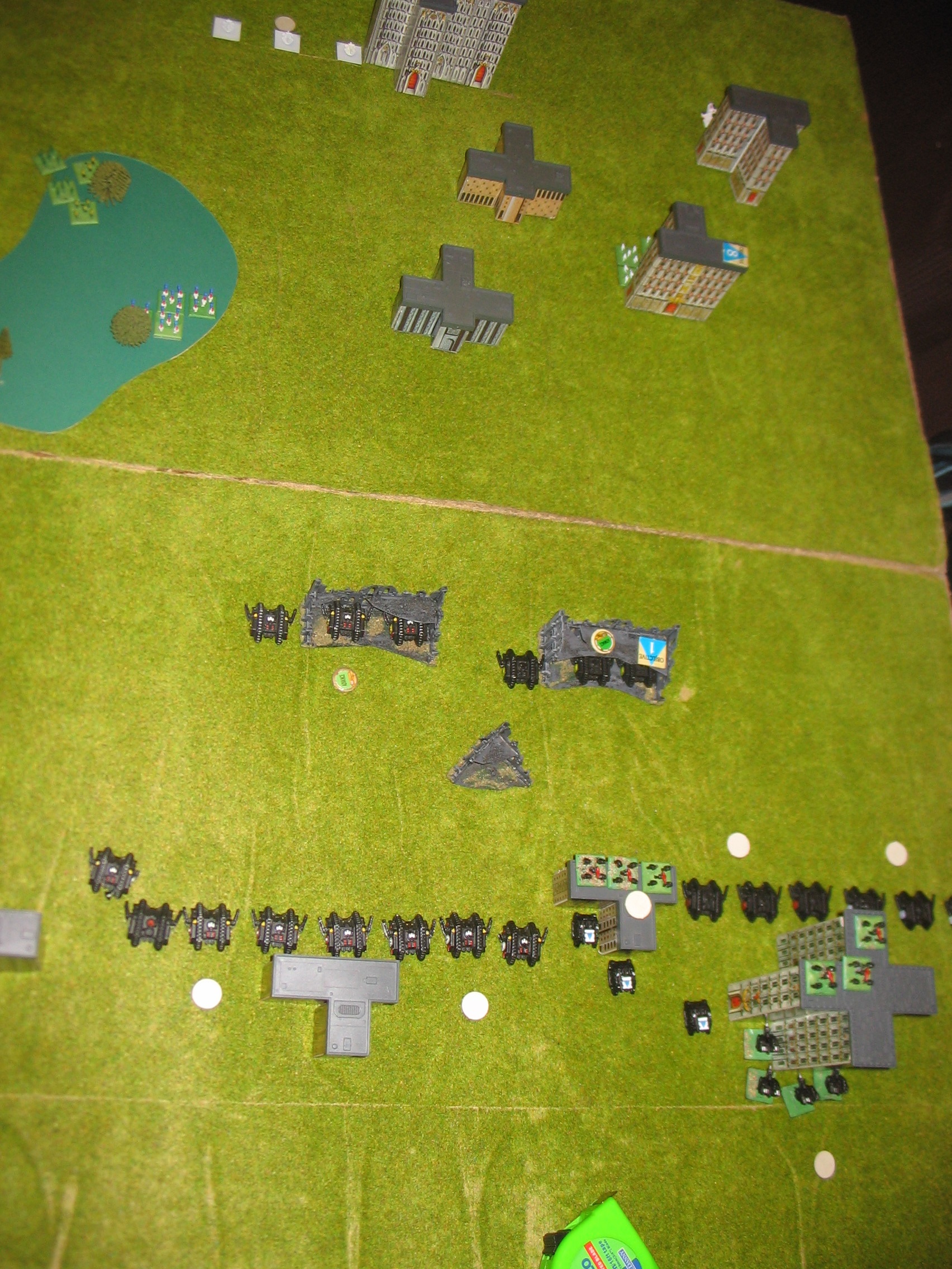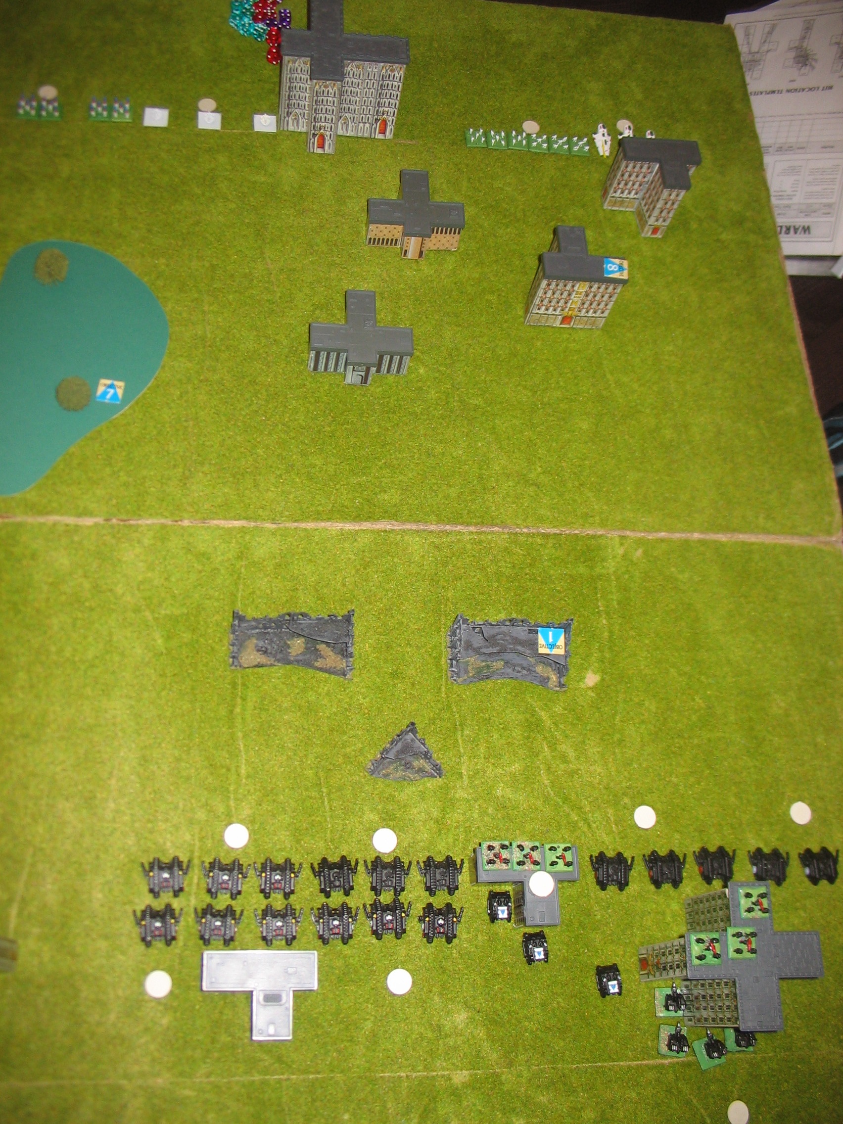 The terrain the battle was fought on was a town (F17 on Campaign Map). The Marine army was on First Fire orders and the Eldar on Advance, meaning that the Marines could deploy an extra 15cm forward of the standard deployment zone and would automatically have initiative on turn 1 of the battle.