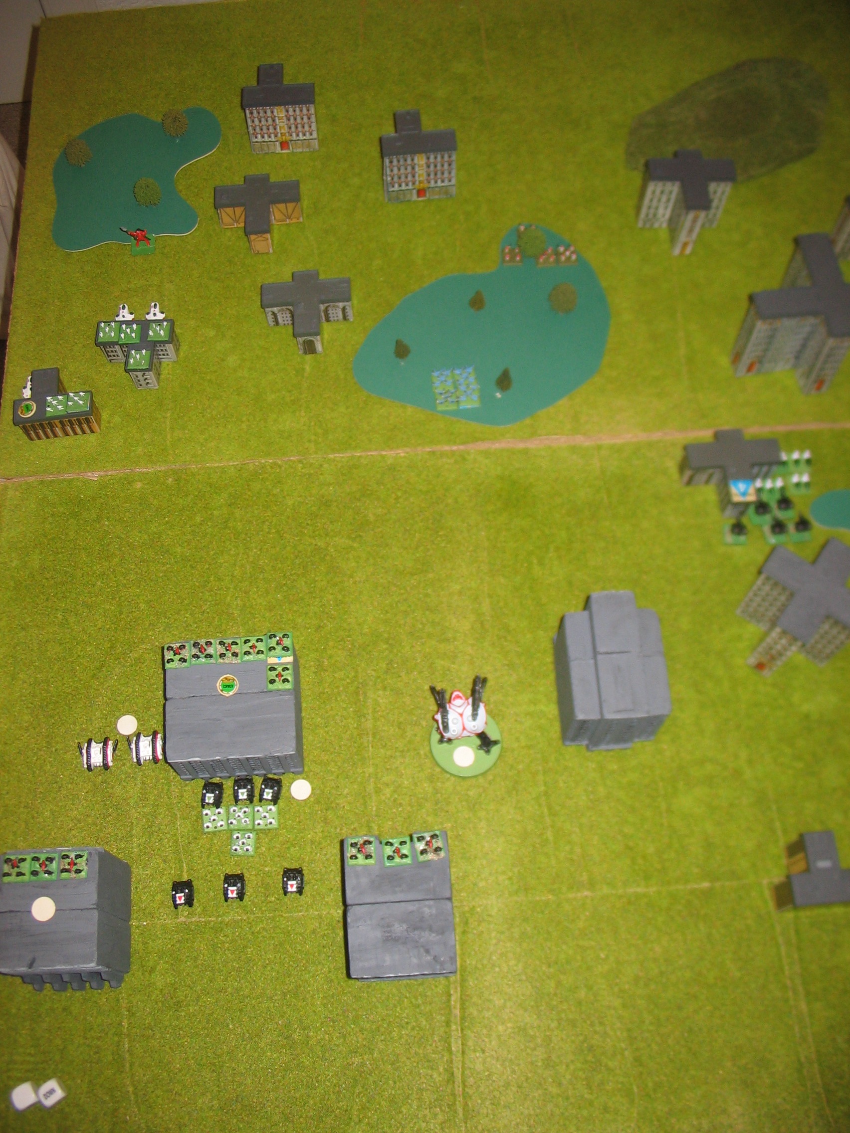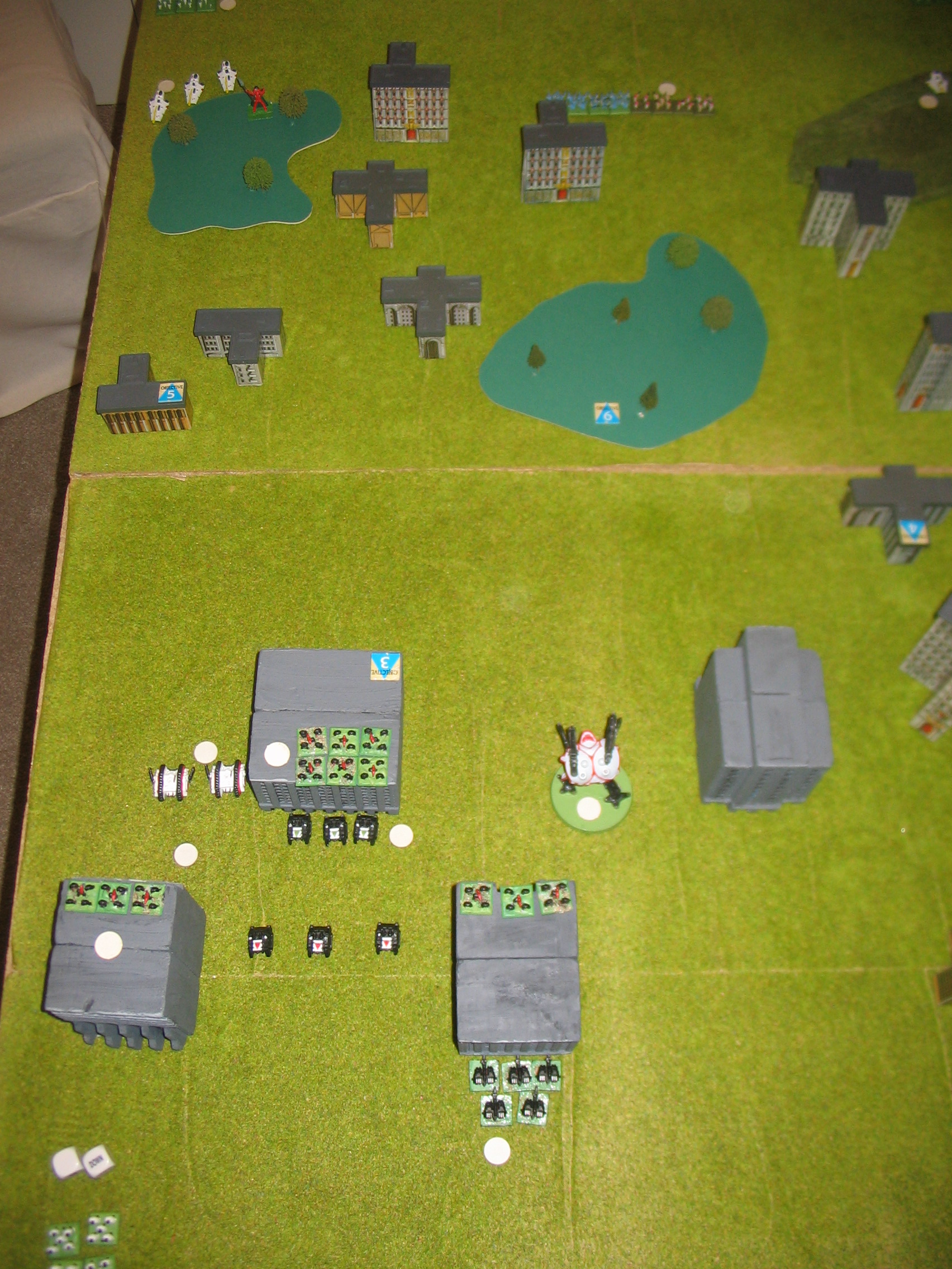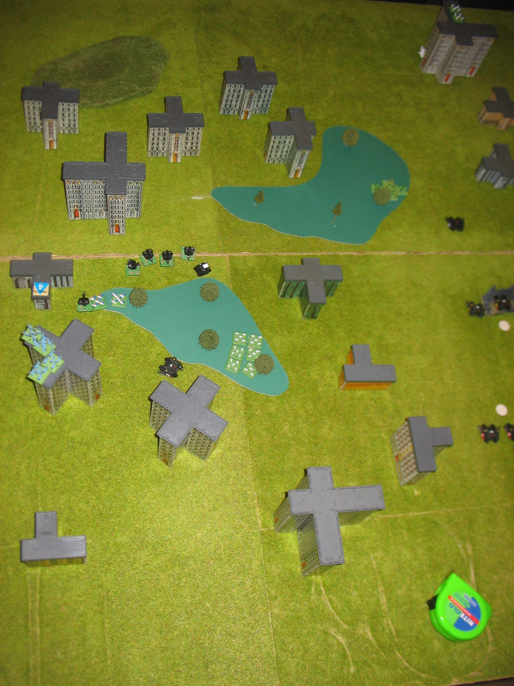 The terrain the battle was fought on was a town (F17 on Campaign Map). The Marine army was on First Fire orders and the Eldar on Advance, meaning that the Marines could deploy an extra 15cm forward of the standard deployment zone and would automatically have initiative on turn 1 of the battle.