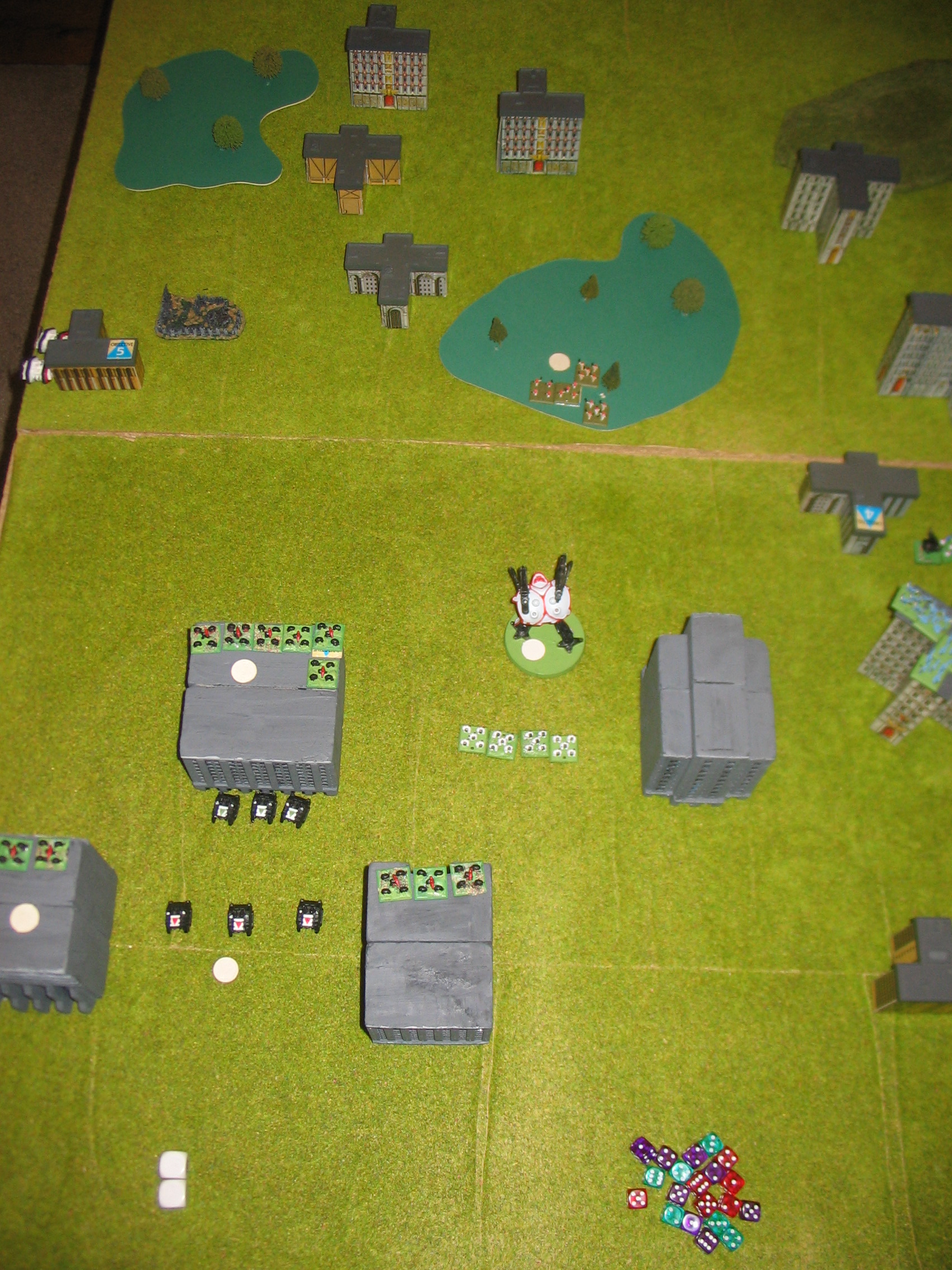 On the left flank, a Warhost detachment takes a battering as my Titan's Quake Cannon reduces a Guardian-infested building to rubble. There is an unexpected bonus as the Avatar fails a save and - ironically - meets its doom at the hands of a Volcano Cannon! The remaining 2 Guardian stands in a nearby building are unable to hide from a massive volley of Devastator missile fire and are eliminated, along with 2 accompaning Grav-Tanks.