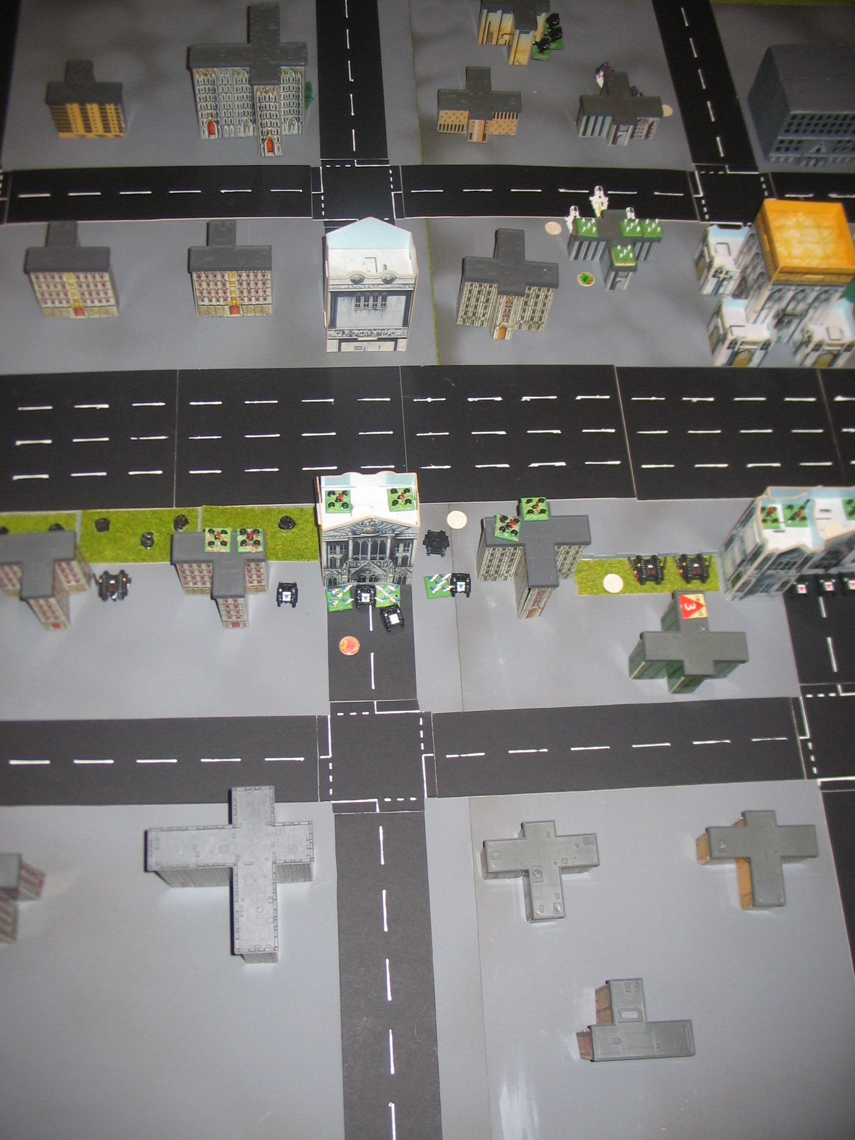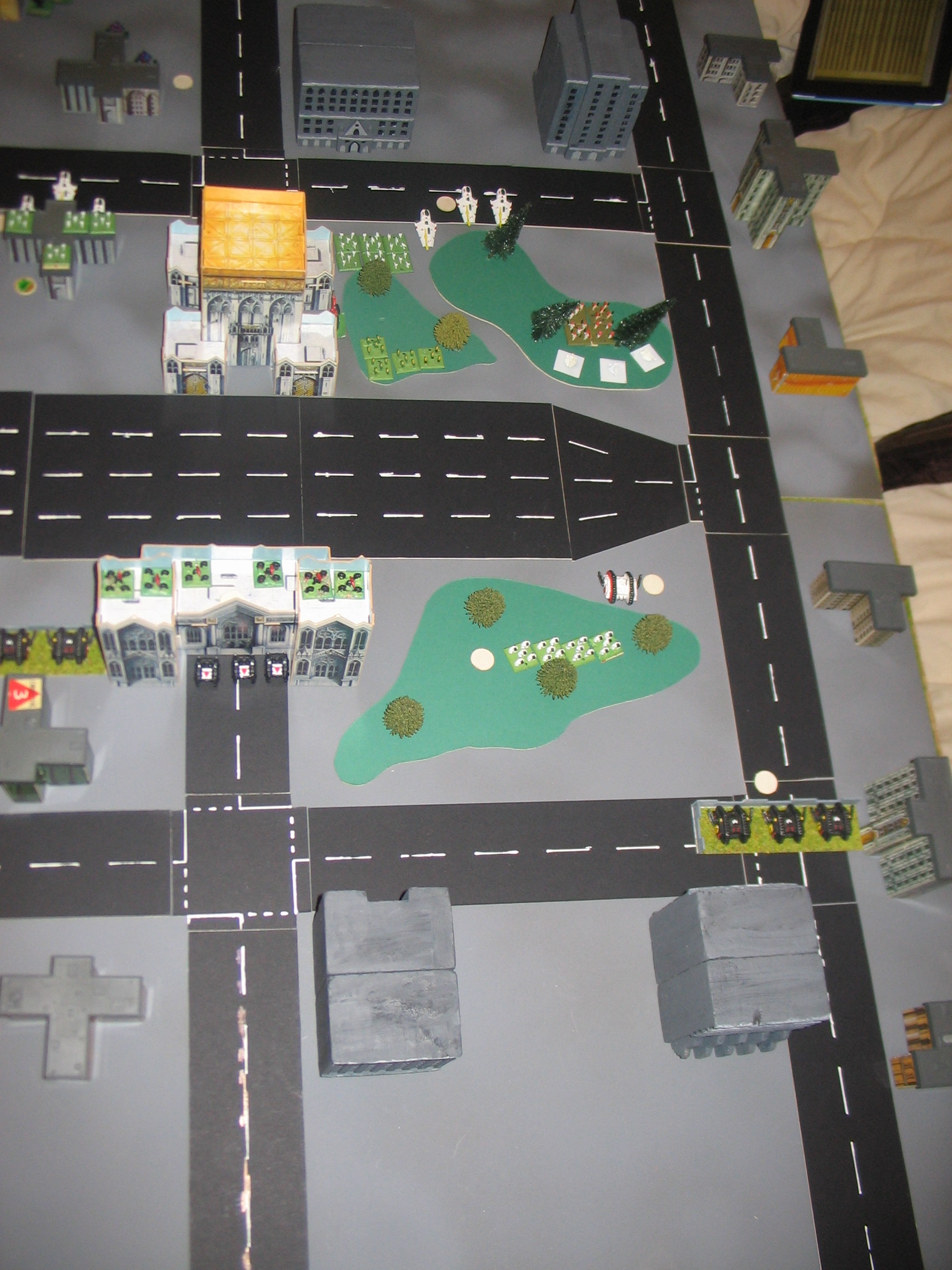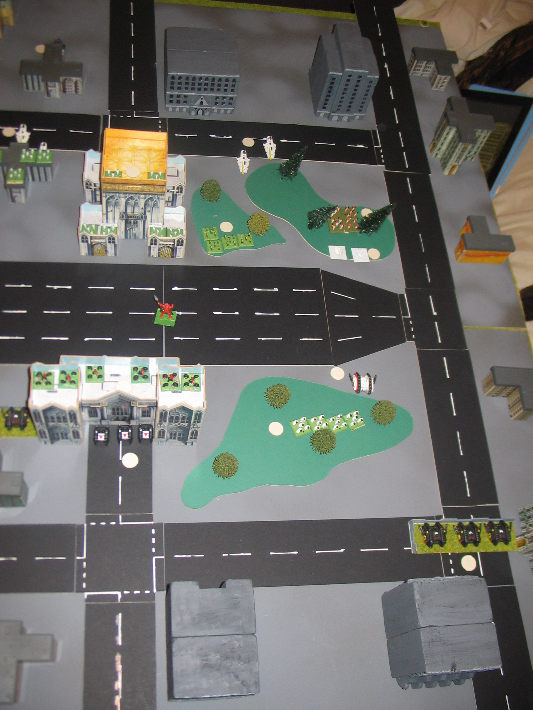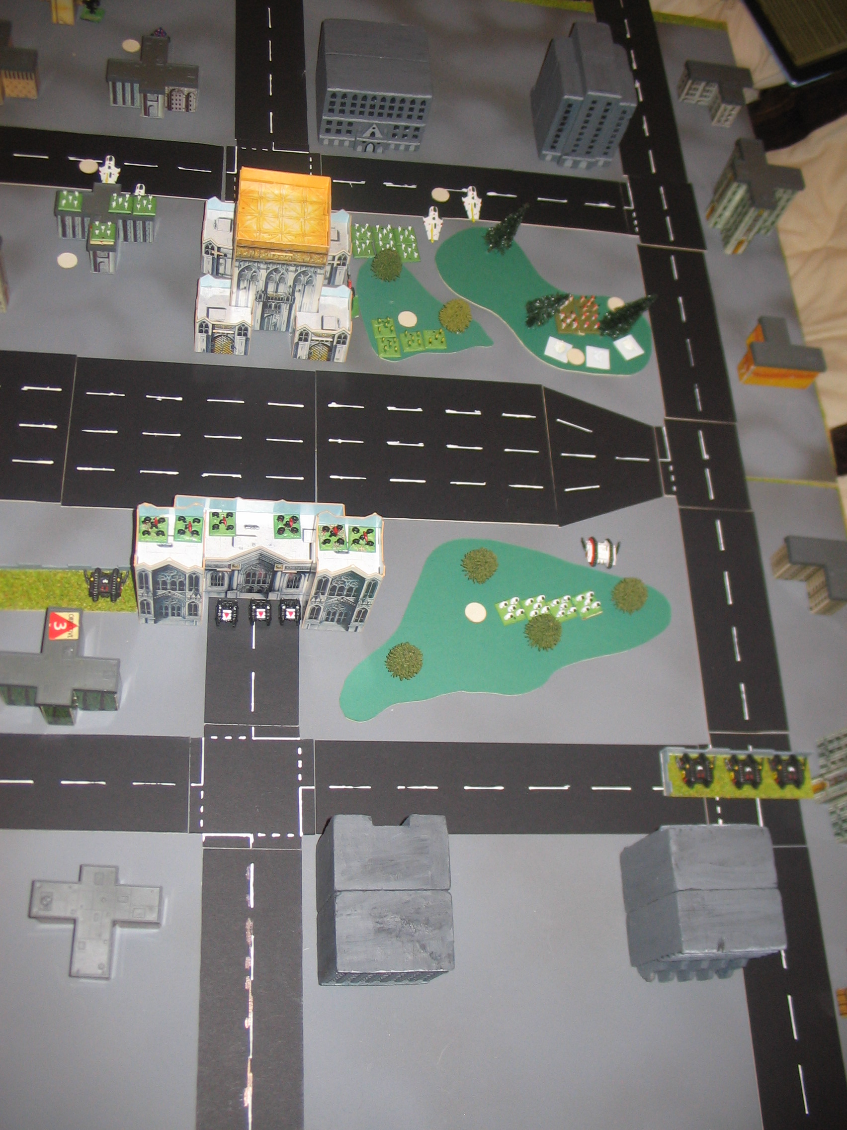 The Warlord Titan trades fire with the Tempests and takes two down. Once again, the shields stand up to the heavy barrage of fire directed upon the titan. Grav-Tanks unleash their fury on the Land Raider copmany on the left flank, destorying just enough to break them. Meanwhile, both sides have dug in at either side of the central freeway and trade fire. Nothing breaks other than a solitary Prism Cannon. A squadron of Land Speeders engage Swooping Hawks and eliminate them, but they in turn are broken by Eldar guns after close combat is resolved.