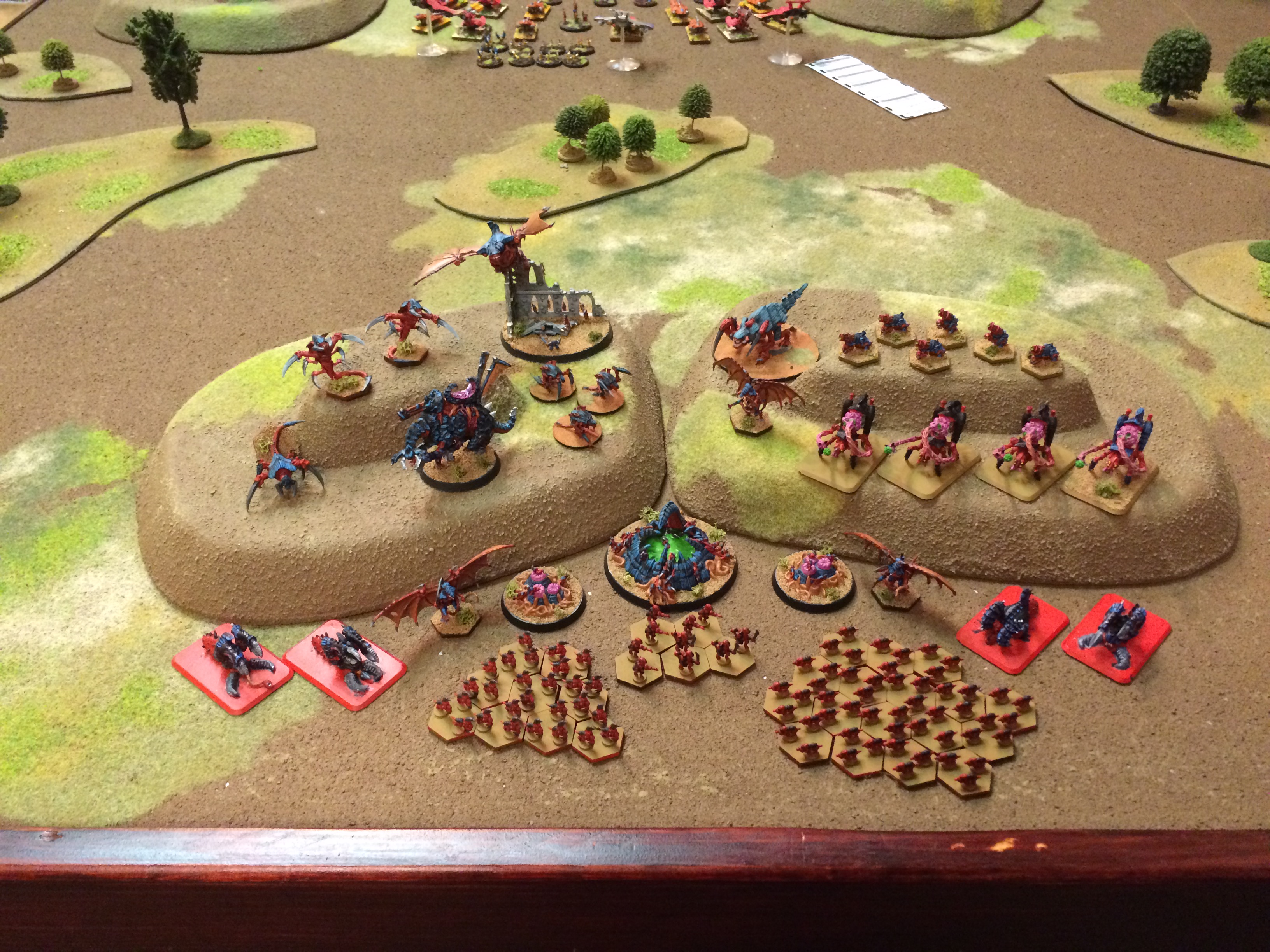 End of Turn 2 aspect warriors (SS and DA with Ex and Aut) transport in on a Vampire Raider, land and assault a big tyranid formations of Armoured vehicles (i forgot the units names). We dispatch them in quick order. AW consolidate closer to the BTS (a Hive tyrant). Start of turn 3 Eldar win initiative, first order of business to launch some falcons to put blast markers and take out some Hive tyrant support and wound the hive tyrant to clear the path for the AW to assault when they retain. I roll for the falcon formation, a 1, but luckily i have my Autarch on board for the re-roll after summarily dispatching one unit they were ready to get into taking out the Hive tyrant, but what do you know the re-roll was also a one. So the falcons crew looked around and blamed each other for lack of communication. needless to say the Hive tyrant saw the Eldar errors and summarily blasted the Aspect Warrior unit away.