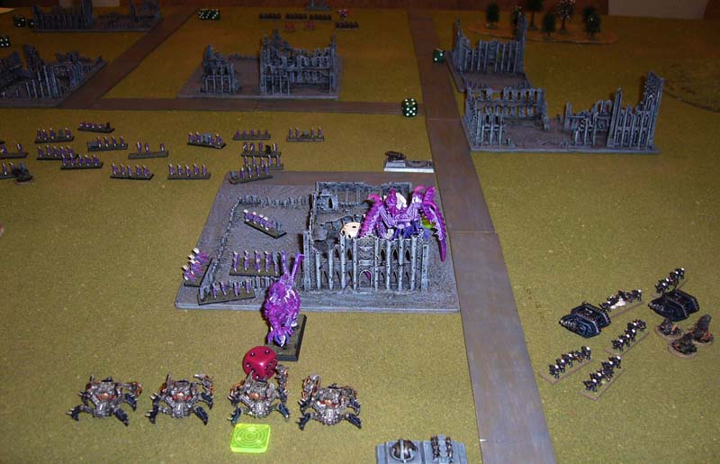 Turn 1: Tyranids rush across the board, Ravager Titan advances and kills a Hierophant, but other two tyranid biotitans close rapidly with it and Warlords formation. One Defiler formation starts flanking around the right (top of picture), the other fails its initiative check and regroups.