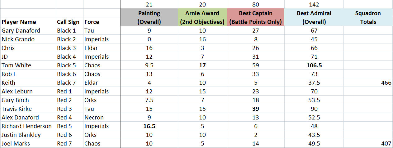 To simplify scoring a maximum of 20 points was available for destroying or crippling your opponents fleet. To keep it really simple a 1000 point fleet gave up a maximum of 20 battle points (1000/50 - 20pts). There were then 5 extra points available for achieving a secondary objective in the mission, such as boarding hulks, capturing the opponents admiral, etc. Finally there were points for painting and sportsmanship. The latter I wouldn't do again because the guys were so nice to each other they all did a little too well in this category!