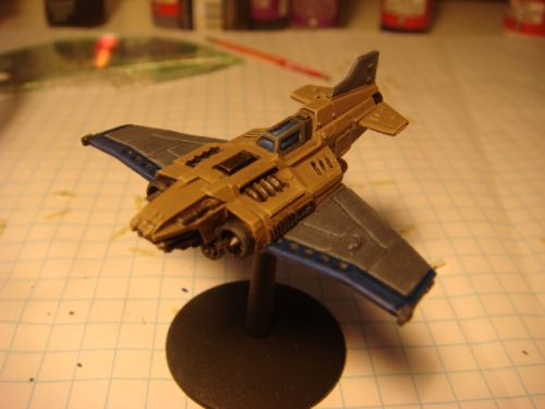 Base of VGC Heavy Brown and Adeptus battlegrey (<- I really need to find a good replacement for that). Highlights in various mixtures of the brown to successively higher proportions of VGC Khaki. Light drybrush of VGC Sombre Grey and extreme highlights of Heavy blue grey. Imperial blue base with blending in Mordian blue on the wings. Finally edge highlight of enchanted blue on the leading edges. Various details picked out and that's that. I'll go back eventually and add in some exhaust effects on the chassis grills and some chip efects/weather on the wing edges, some kill markers, maybe even some nose art but that can come once the flight is complete.