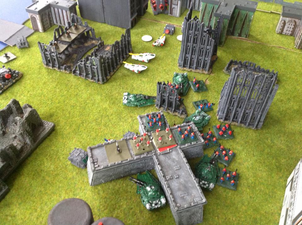 Eldar, IG & Squats each spend 5k on forces. Eldar starts the game in the middle of the board in a town, IG and Sqauts set up at opposite corners of the board. There are three objectives to be captured. The Eldar player will win if he holds the central objective in the stronghold at the end of the game. The other players will win if they capture one objective and the central objective. VPs for breaking units are ignored.