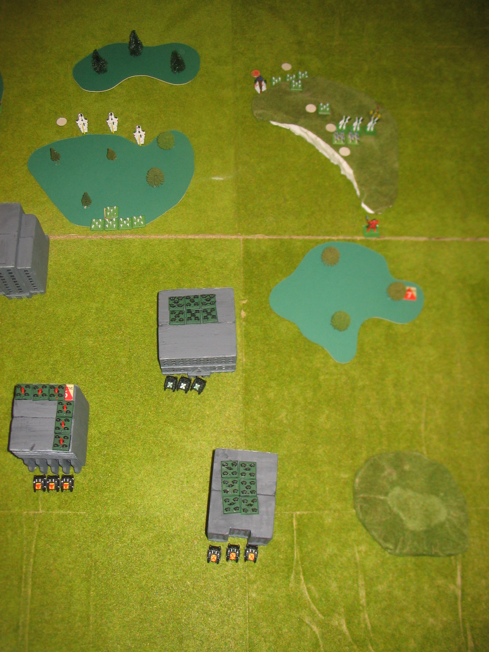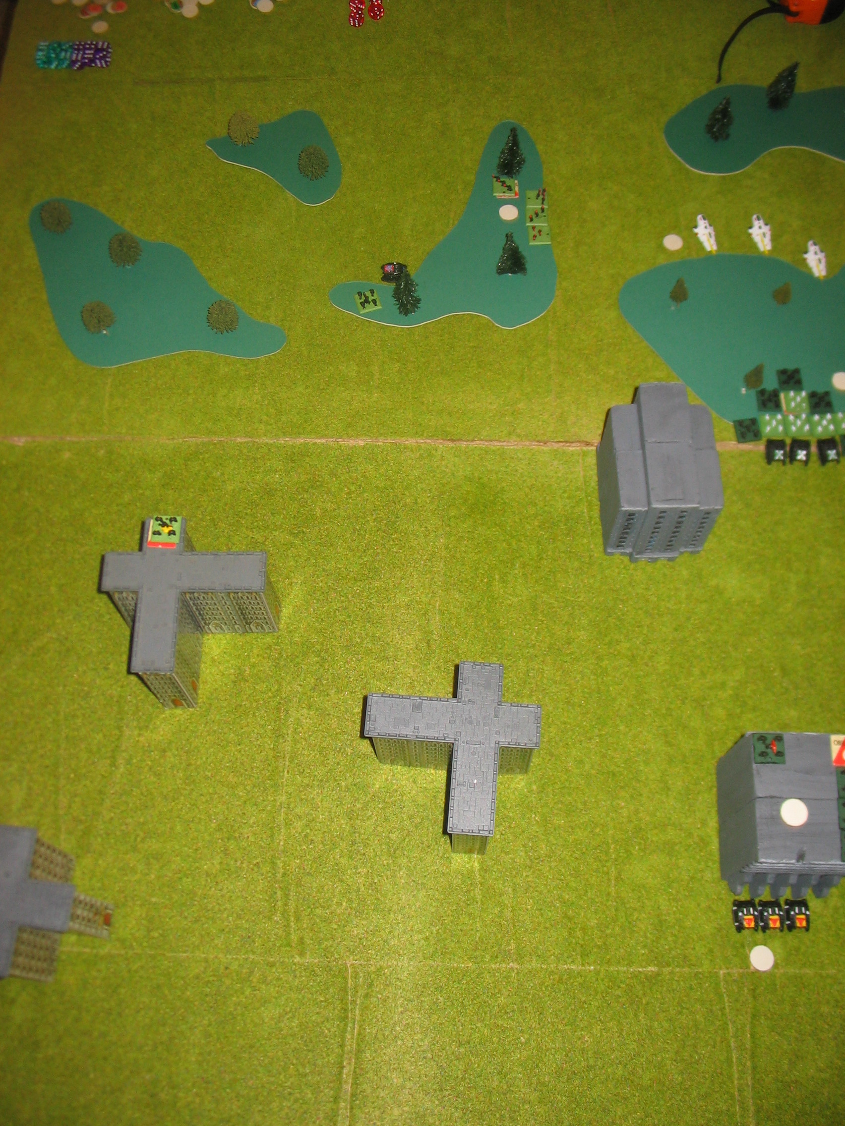 Centre Flank: Assault troops move into buildings preparing for an onslaught on the woods in turn 2. They deliberately do not head for the woods straight away. This will draw the Avatar away from the wood battle in turn 2...