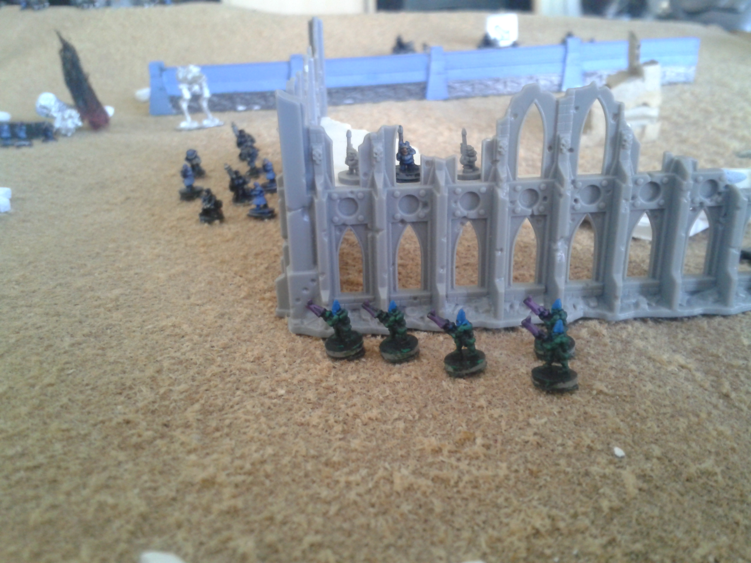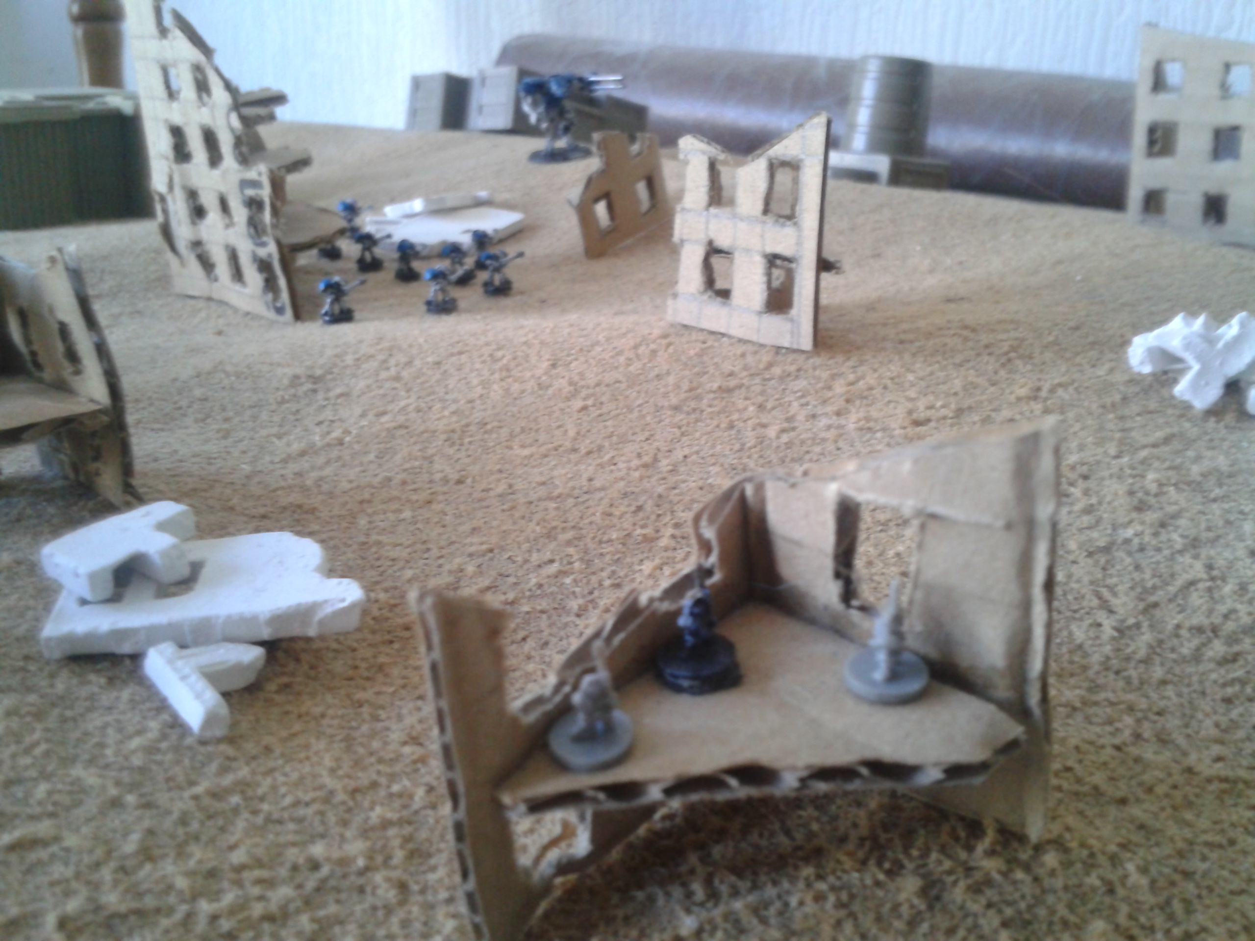 The earthshakers once again fire, this time at the Vanguard squad. The shots both miss, but strike the building adjacent to them, destroying both it and two of the three elites. The survivor wisely chooses to flee, over the cheers of the battlecannon crews.