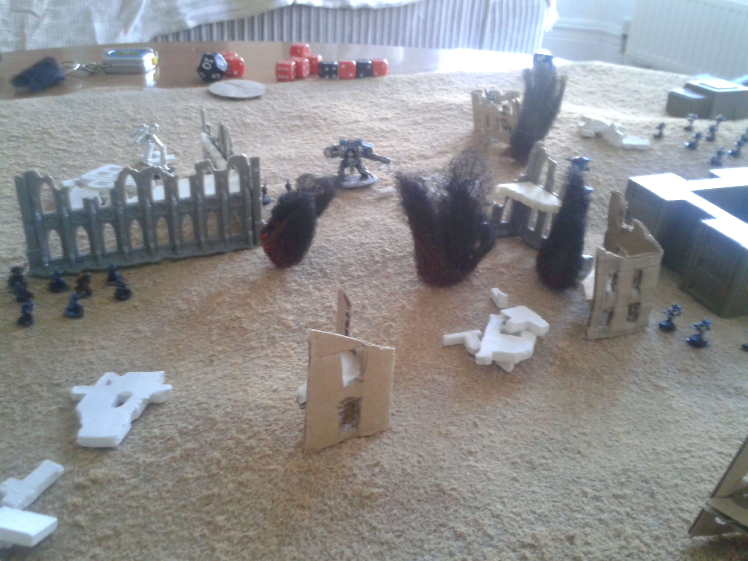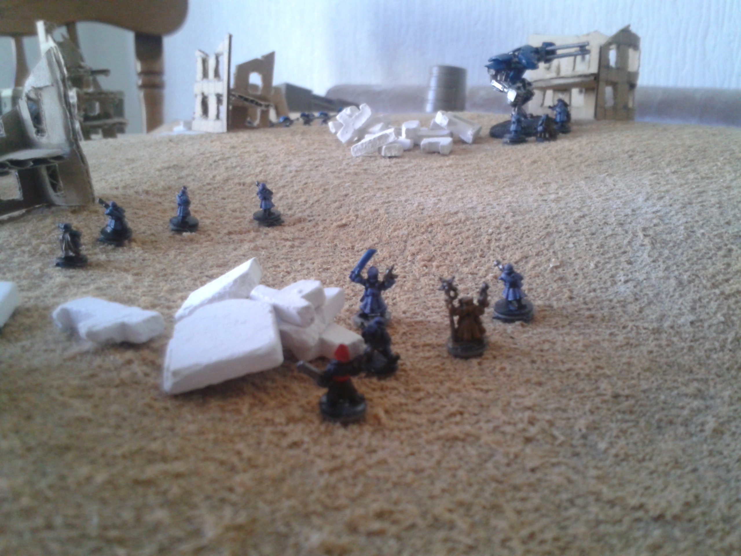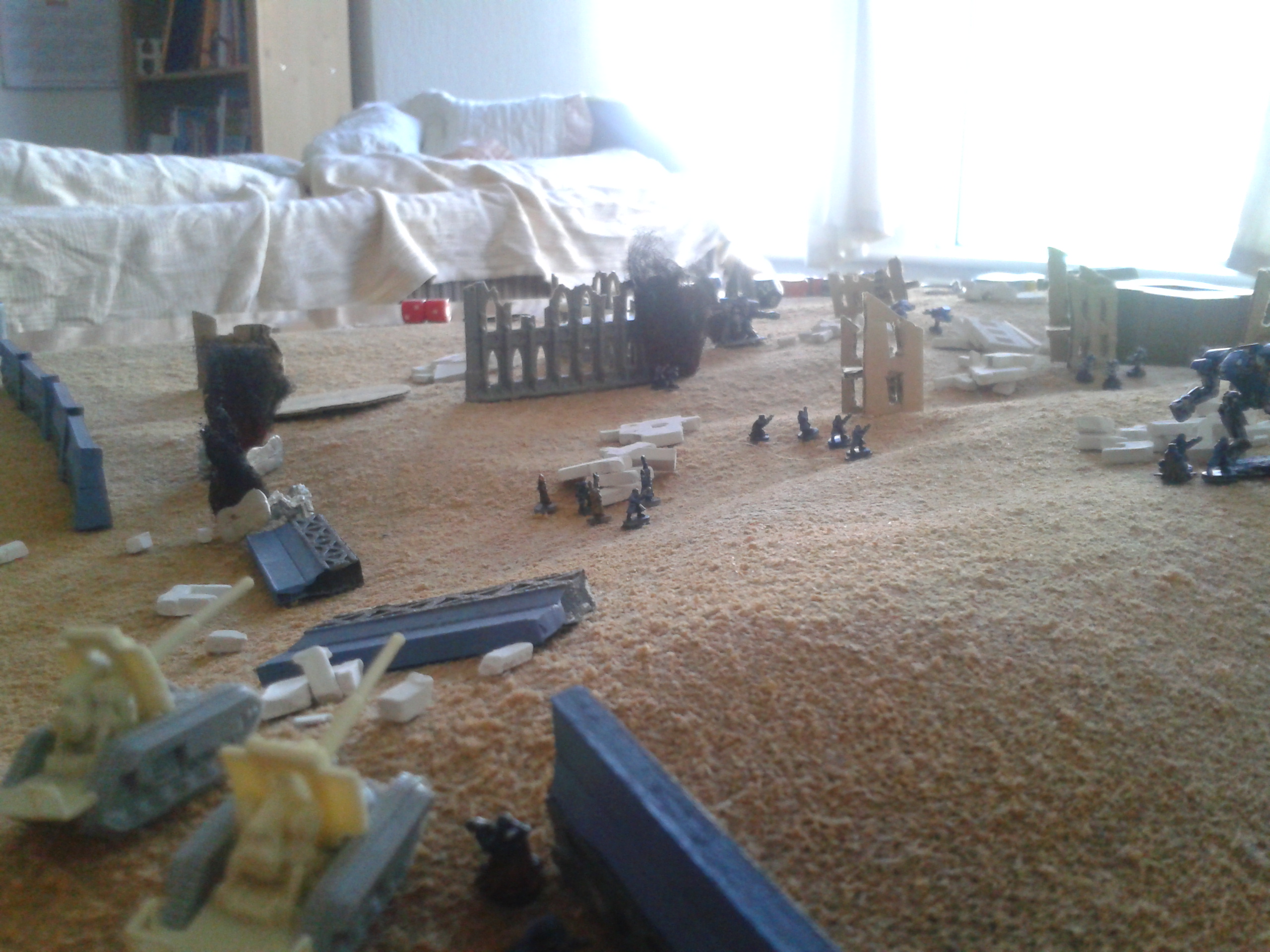 The Basiliks open again, hammering the Mantragan whilst it was distracted with the infantry. The infantry are destroyed in the blast, with the crew's reluctance to follow the friendly fire orders overcome by the presence of the commissar in the nearby command squad. The heavy bolters spray shells into the smoke and dust, with the fire altogether resulting in damage to the ammo feed of the twin-linked autocannon in addition to stabiliser damage. The consequence being that the pilot loses control of the walker. The malfunction soon proves to be less of a concern following the subsequent destruction of the machine after a second barrage.