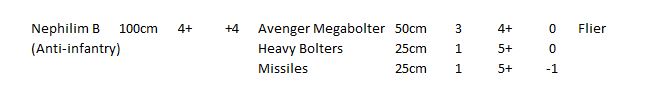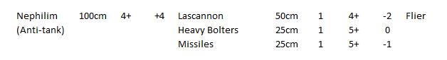 I'm not 100% sure on how the movement, save and CAF should stack up to other fliers, I went with what the Thunderbolt has as it seemed nice and middling. In the codex the missles are suppsosed to be used on enemy aircraft and light vehicles so a -1 seemed appropriate, maybe they should also be listed as AA weapons (if fliers need that). The 4+ on the main weapons might be a bit much.