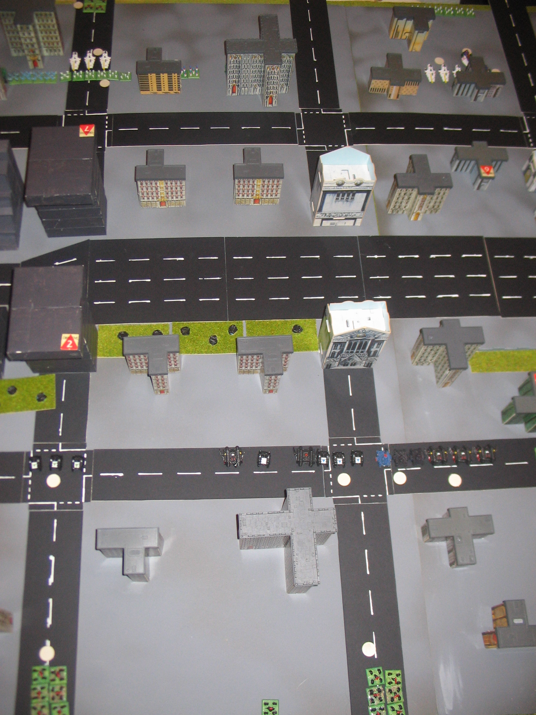 The battle was fought on city terrain (E15 on Campaign Map). The Marine army was on First Fire orders and the Eldar on Advance. The Marine player could deploy an extra 15cm forward of the standard deployment zone and would automatically have initiative on turn 1 of the battle. The Marines can set up their defences anywhere on their half of the board. The Eldar set up within the standard deployment zone.