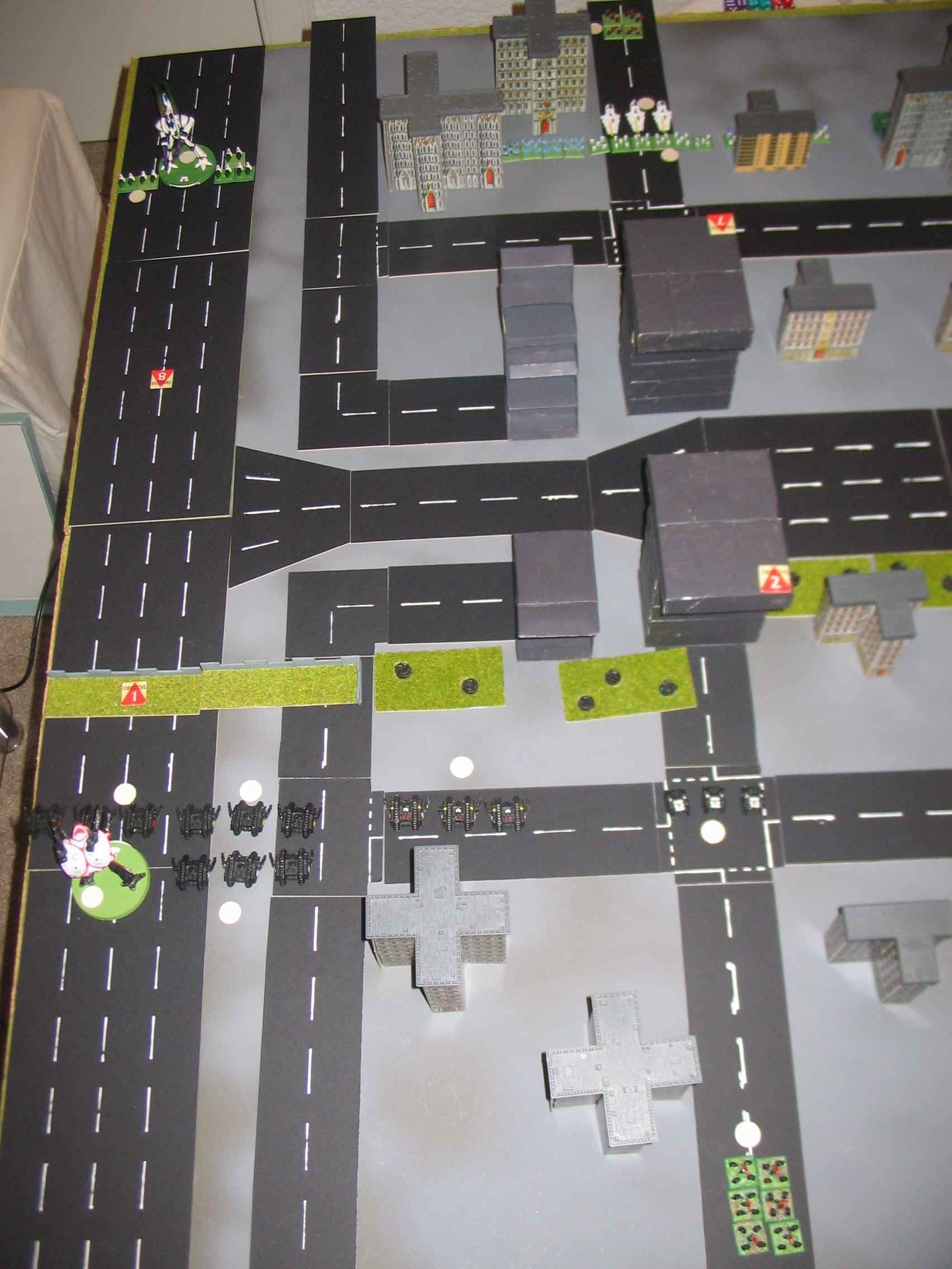The Warlord Titan trades fire with the Tempests and takes two down. Once again, the shields stand up to the heavy barrage of fire directed upon the titan. Grav-Tanks unleash their fury on the Land Raider copmany on the left flank, destorying just enough to break them. Meanwhile, both sides have dug in at either side of the central freeway and trade fire. Nothing breaks other than a solitary Prism Cannon. A squadron of Land Speeders engage Swooping Hawks and eliminate them, but they in turn are broken by Eldar guns after close combat is resolved.
