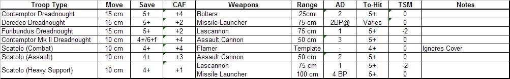 I have nothing against people wanting to use all the models available, I just think we need to make sure that the stats give a close approximation to what the models are. The stats in the rules for the old Contemptor, don't actually relate to the model since it should be armed with 2 twin linked bolt guns, not a heavy bolter. And why does the Furibundus have zero CAF when the Deredo has +2, they are similar machines just with different heavy weapons?