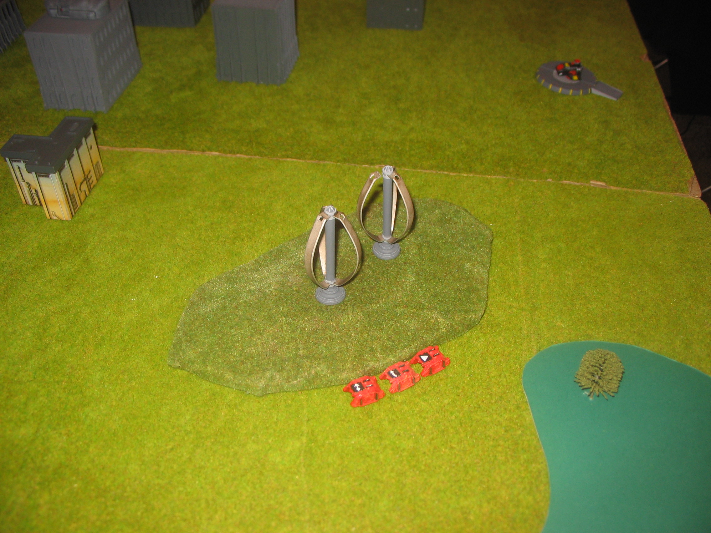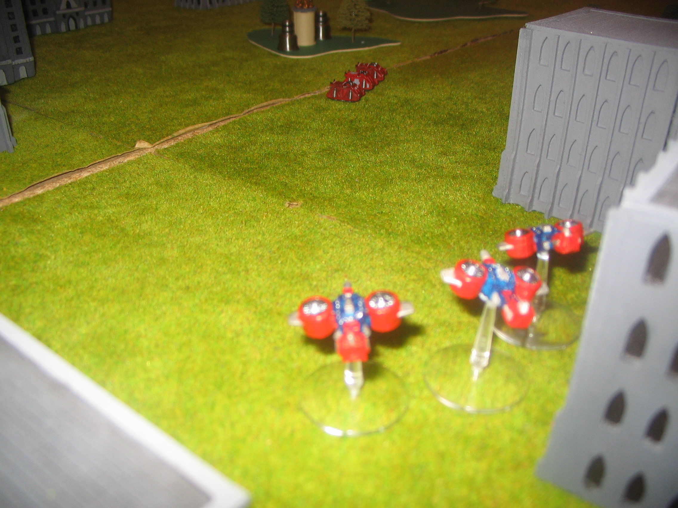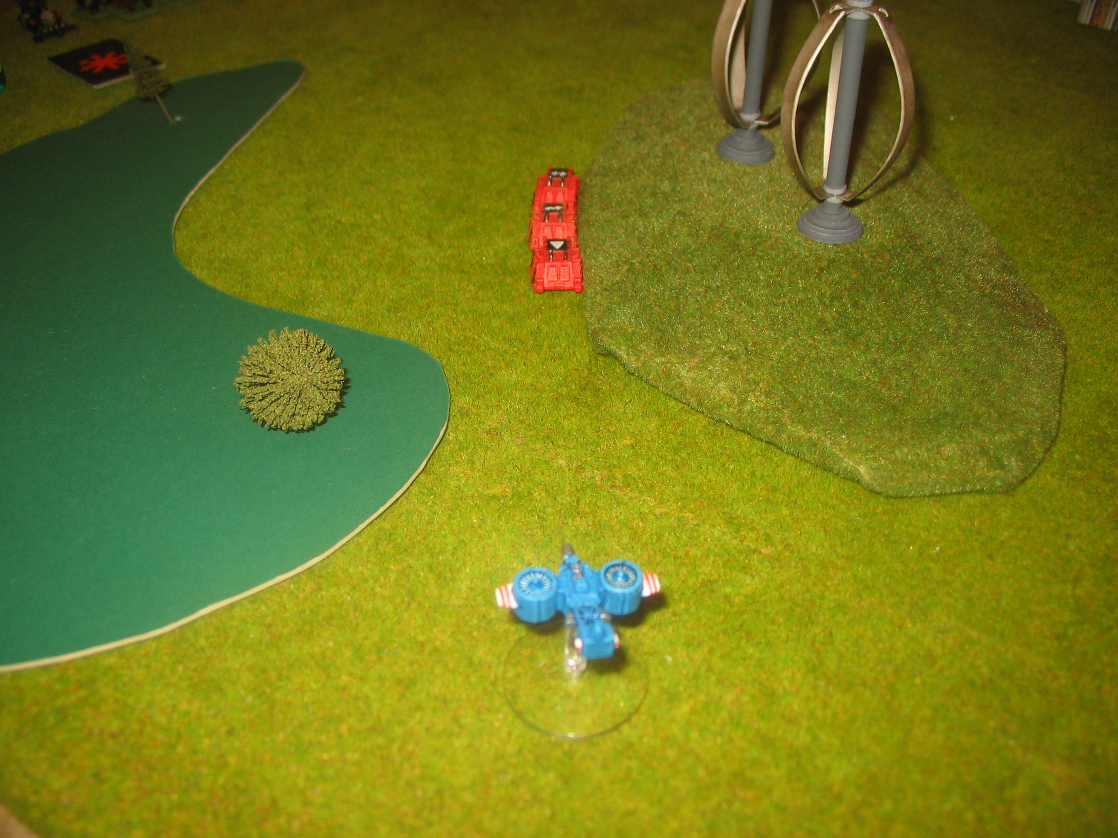 File comment: Meanwhile, the Collosus' spotter vehice swoops across the board, up the left hand side. It is swift enough to get into position to locate the transports carrying the Chaos Marines into battle. With the Iron Eagle's information, the Collosus fires its Doomsday Cannon in a direct barrage attack...