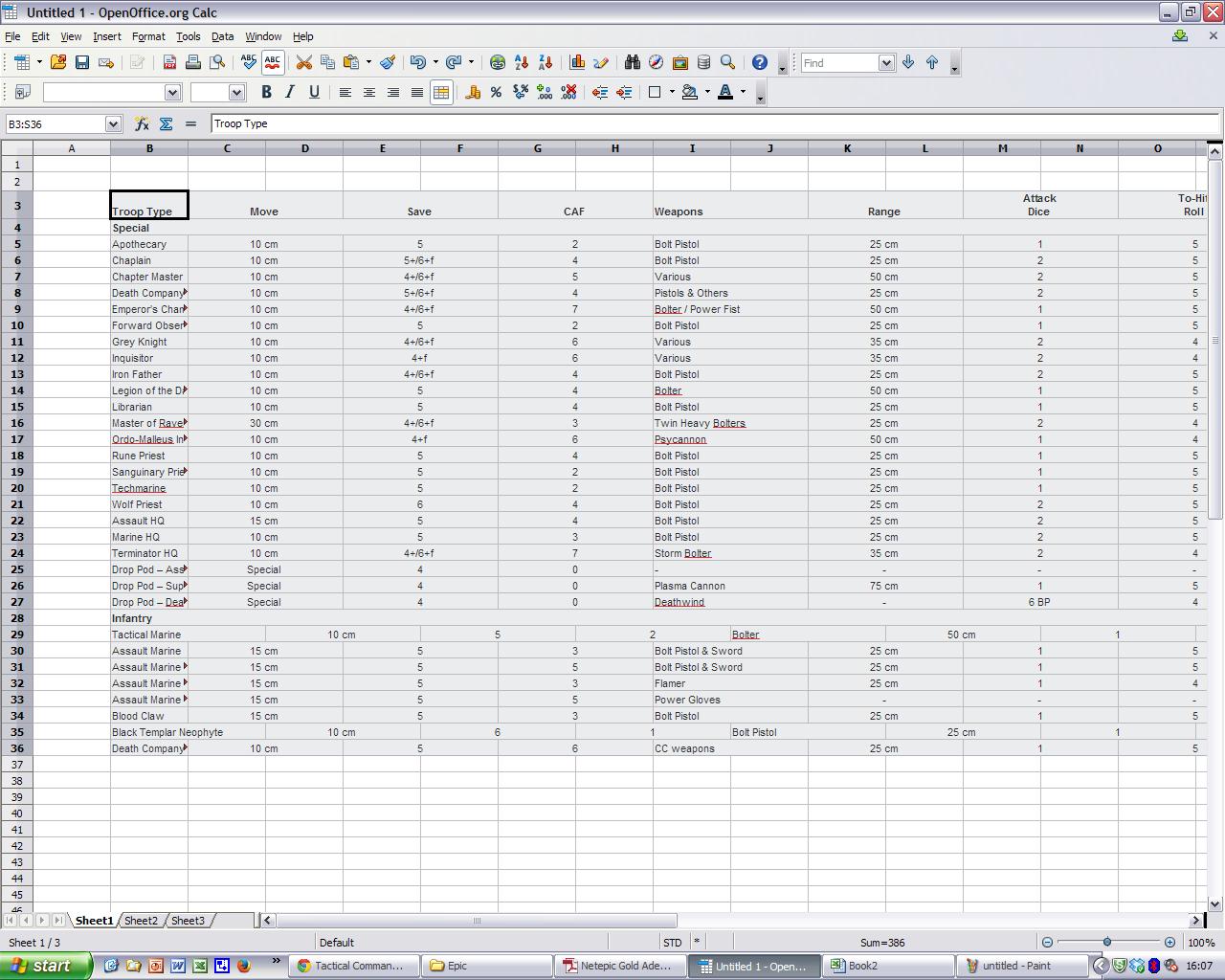 Okay, now that is really odd. Not sure what options I used, will have to check. But like some of the others, copying straight from the PDF into excel made everything on a row appear in a cell, but I tried exactly the same thing with open office and all the stat information appears in separate boxes, even those units with multiple weapons have them appear in a single cell, stacked ontop of one another, with the attack dice for each weapon in the next cell, all stacked on top, then the "to hits" etc. Then when I copy that information into excel, everything stays in their cells.