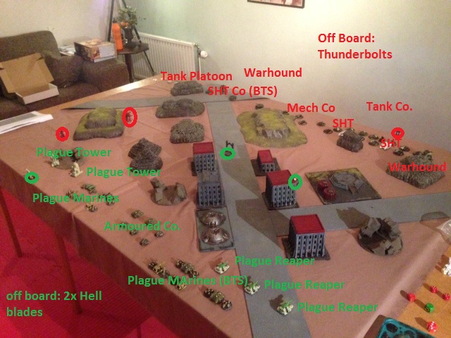 Nurgle: Plague Tower on left flank sustains on tank platoon, 2BM. Nurgle: Plague Marines retain and engages Mech Co. Killing all but 1 stand and gives SHT Co 1BM.
